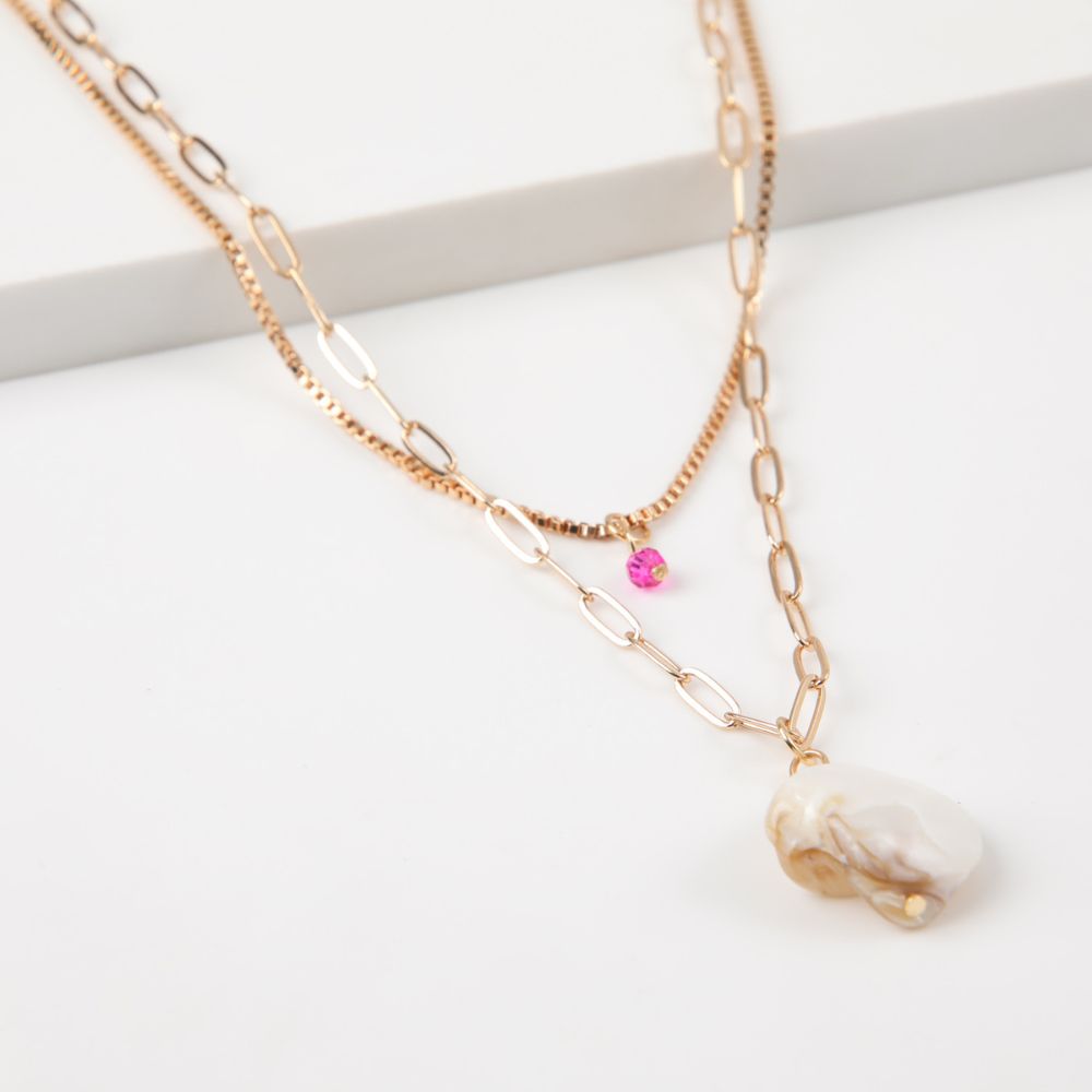 Collar doble dorado de cadena corta de eslabones cuadrados pequeños con dije de mostacilla rosada y cadena larga de eslabones ovalados con dije de piedra de fantasía en tonos cafés y blancos.