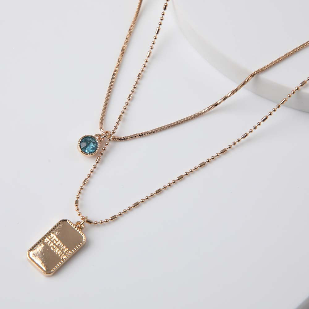 Collar Corto i-D Sun de color azul. Collar doble, el más corto es una cadena plana con un cristal de fantasía celeste colgante y el más largo es una cadena con eslabones redondos con un charm rectangular dorado colgante.