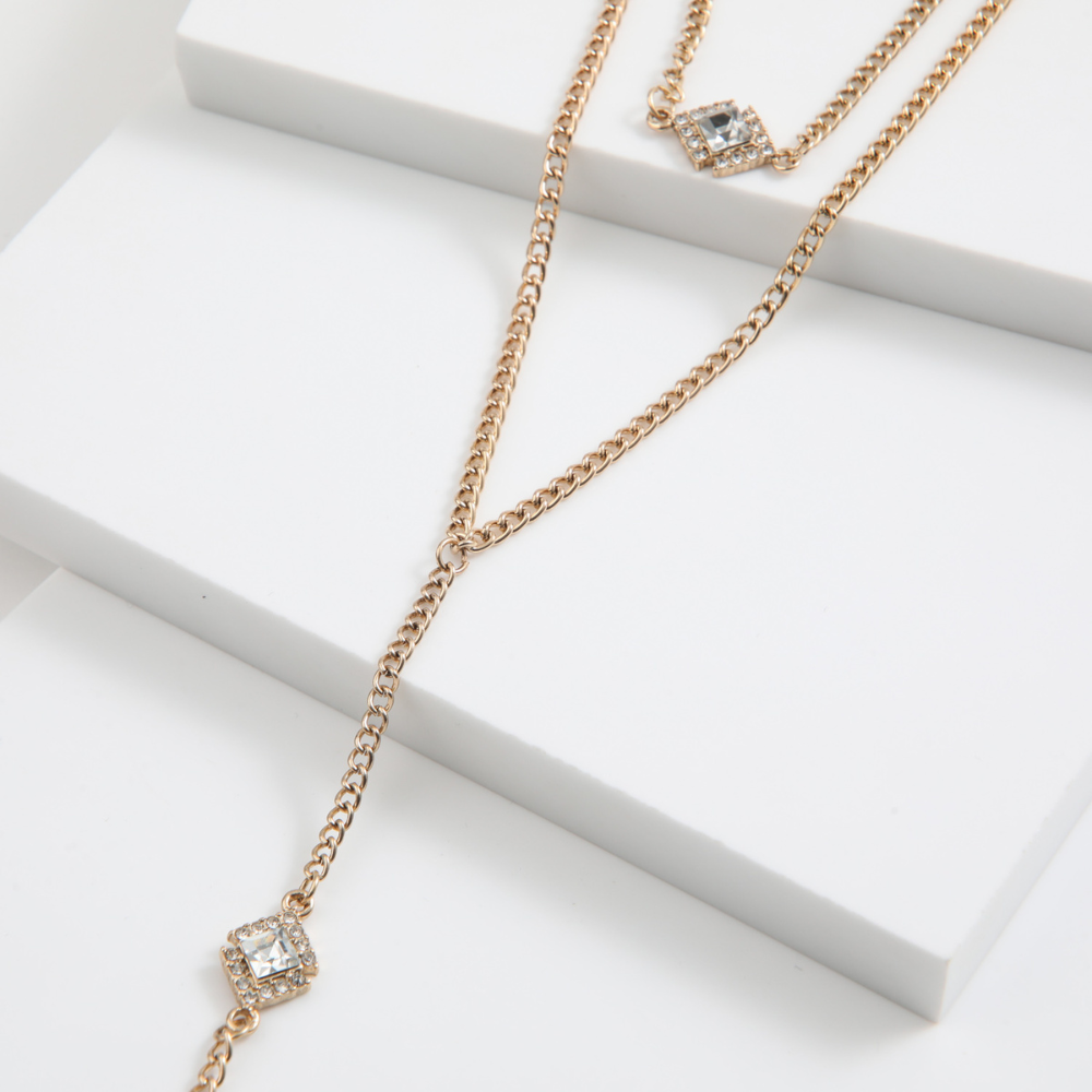 Collar en metal dorado. Consta de dos cadenas de distinto diametro y dos dijes de brillantes de fantasía blancos en posición de rombo, el más largo terminado en una cadena vertical larga.
