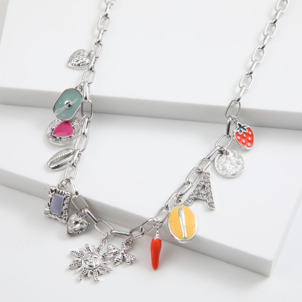 Collar corto en metal plateado. Consta de cadena ancha y varios dijes distintos con brillantes de fantasía blancos y terminaciones esmaltadas de diferentes colores.