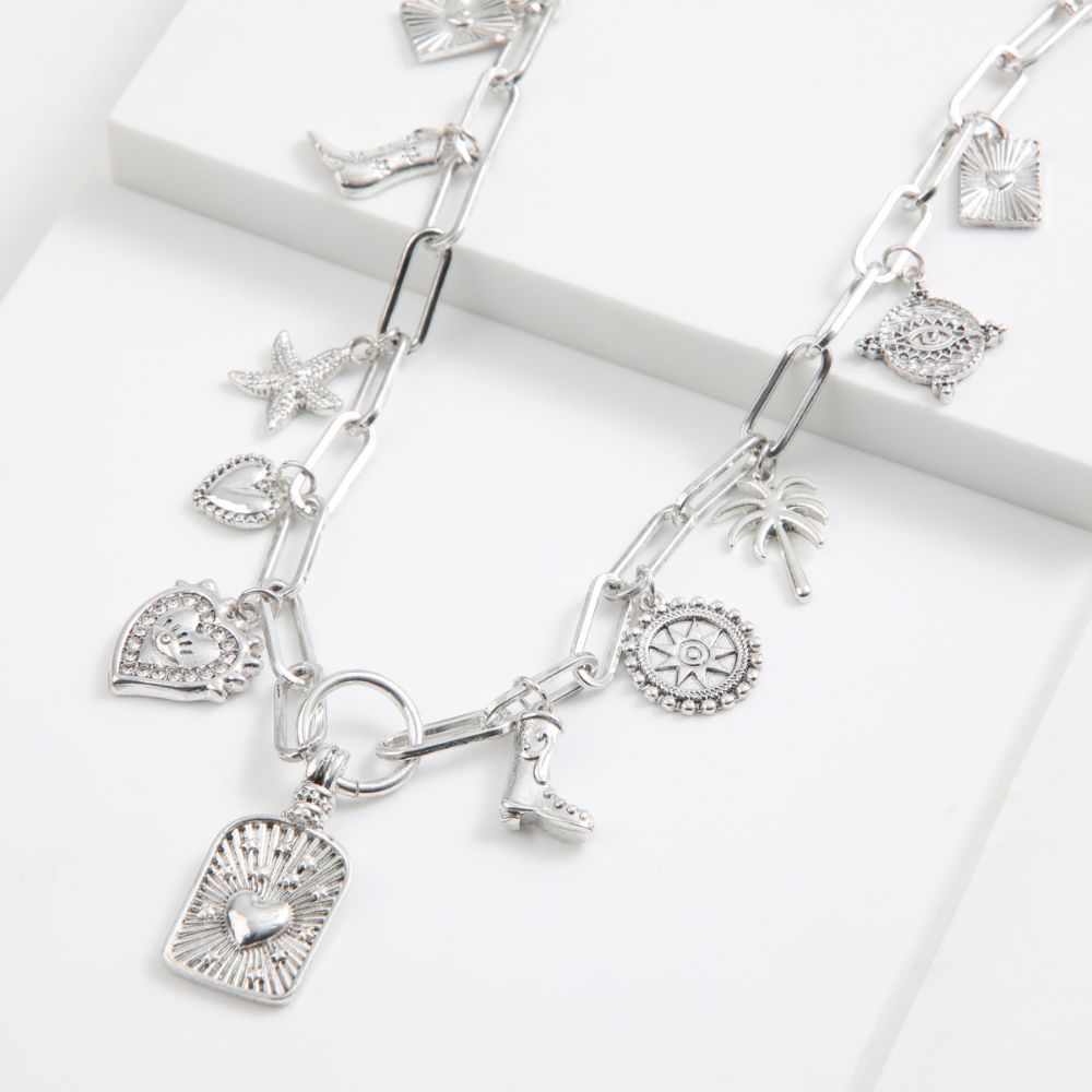 Collar corto en metal plateado. Consta de cadena ancha con varios dijes de distintos tamaños y figuras con formas y dibujos de estrellas, corazones, botas y ojos.