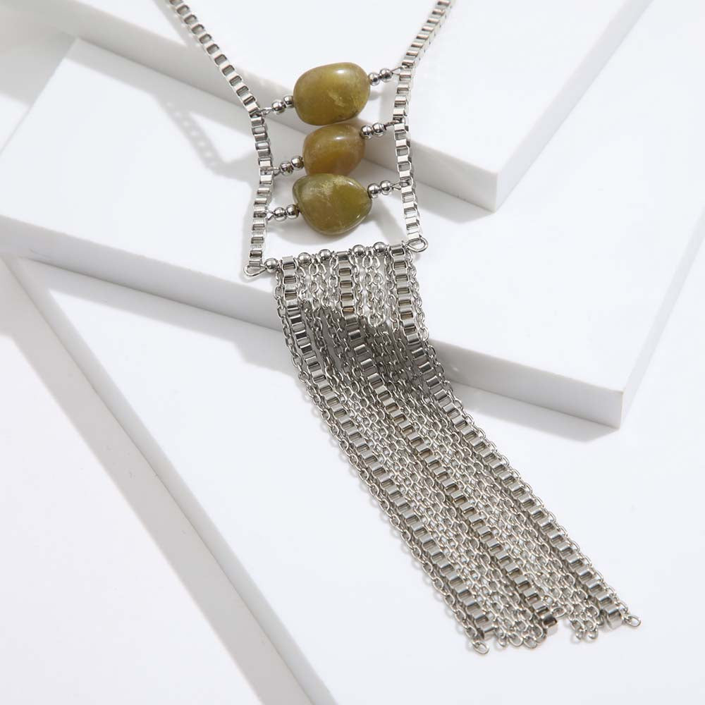 Collar Humana Avilés largo verde que pertenece a la colección Nephrite Green. Collar Plateado tejido con cadenas de metal y 3 piedras en color verde.