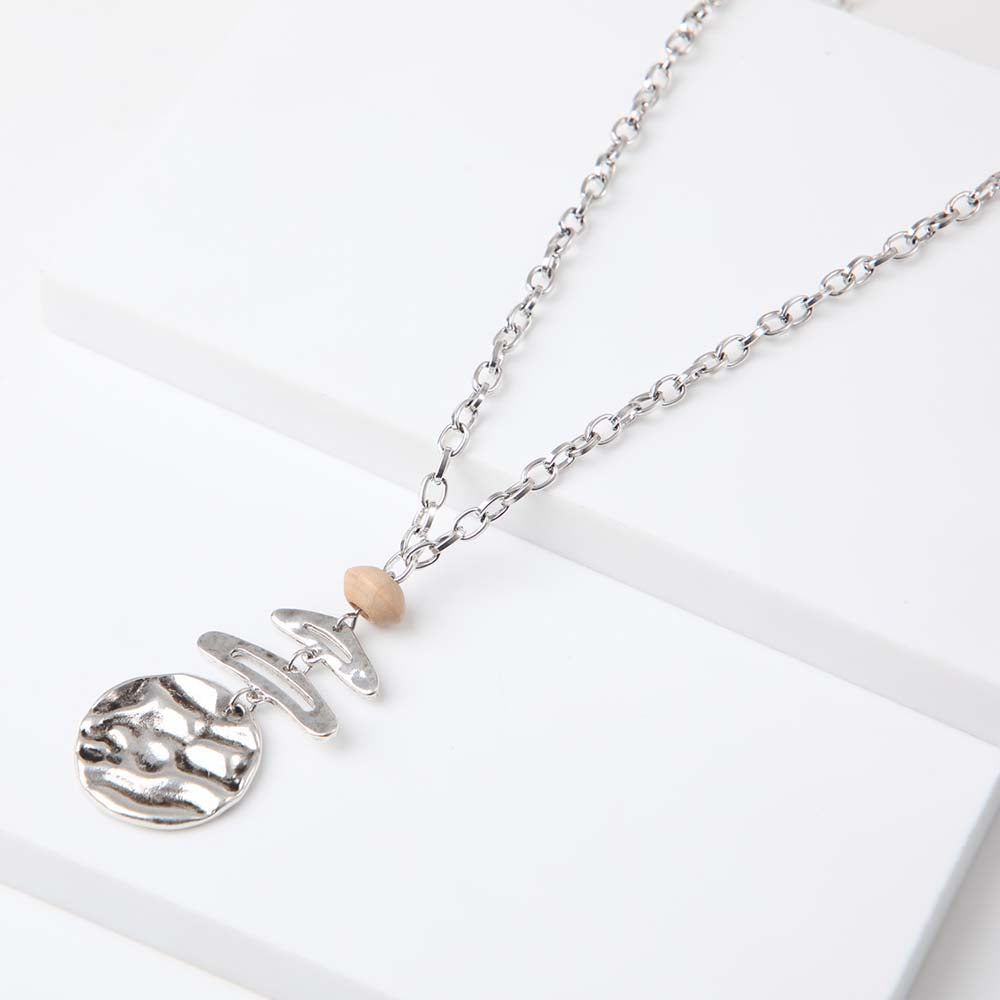 Collar Largo Humana Cádiz de color naranjo perteneciente a la colección Coastal Breeze. Este collar esta compuesto por una cadena conun colgante al centro compuesto por una mostacilla naranja faceteada, dos dijes abstractos y un dije circular martillado.