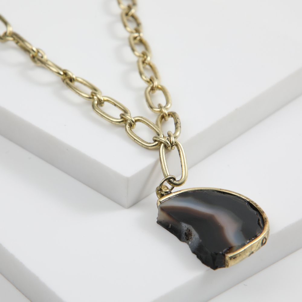 Collar largo de eslabones metálicos dorados con dije de piedra semipreciosa en semicírculo con tonalidades de café y blanco.