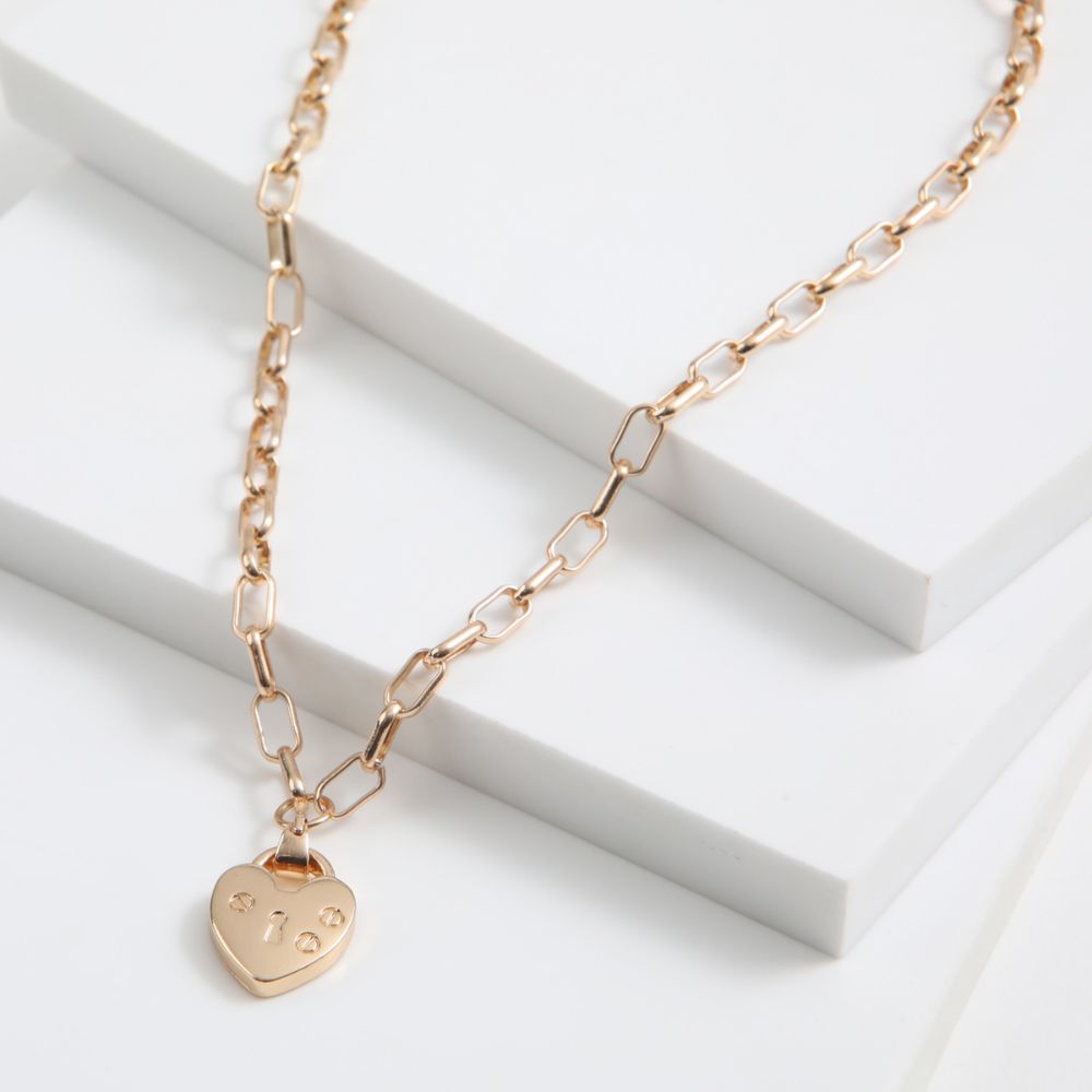 Collar tipo choker en metal dorado, consta de una cadena con dije de candado con forma de corazón.