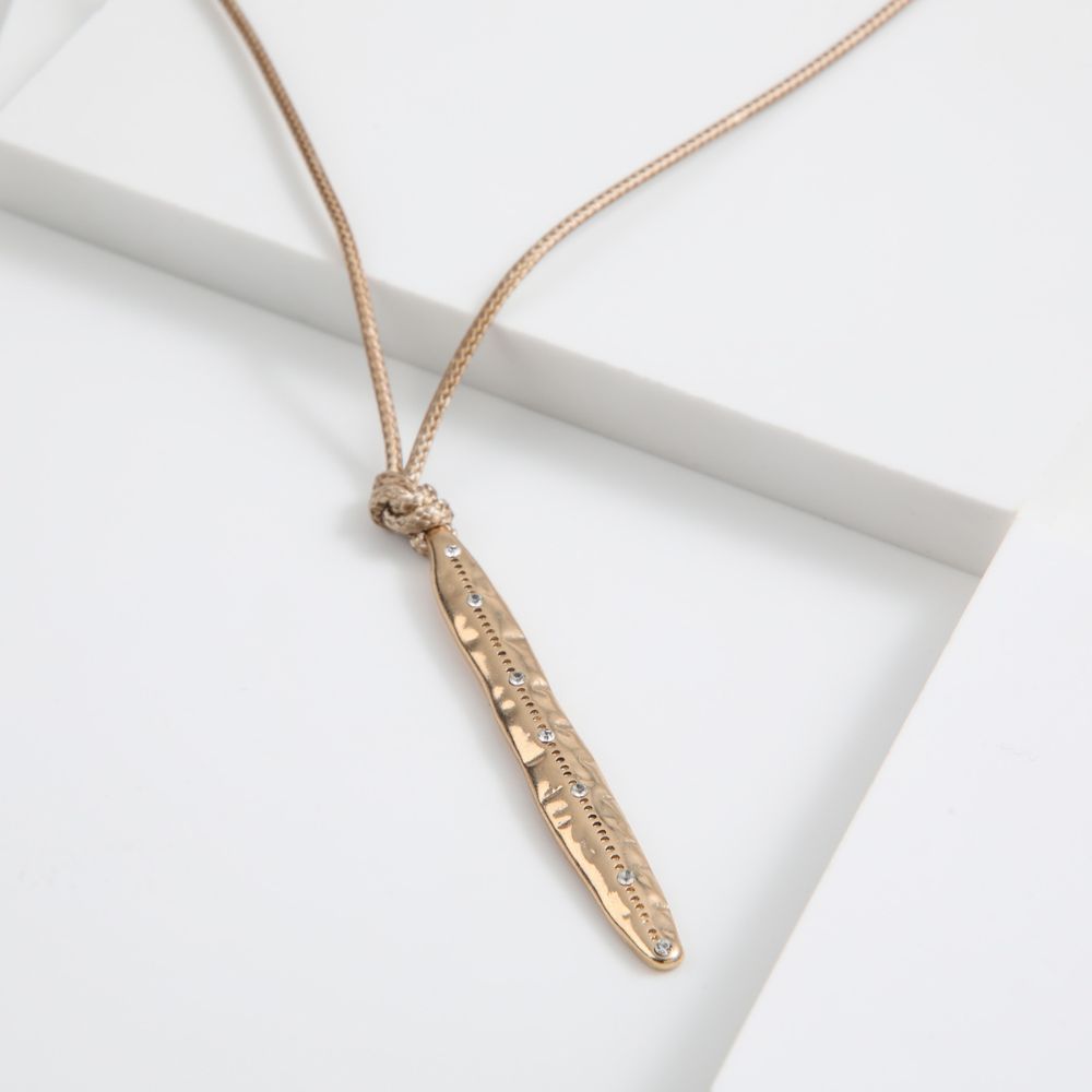 Collar largo compuesto por cuerda beige y dije de figura alargada irregular con columna de círculos y brillantes de fantasía blancos pequeños por el centro, en metal dorado.