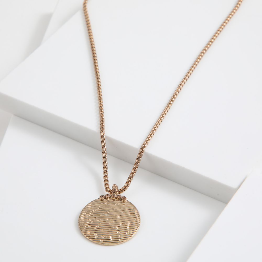 Collar corto en metal dorado. Consta de una cadena tubular y dije circular con brillantes de fantasía dorados por la parte superior y textura de líneas horizontales.