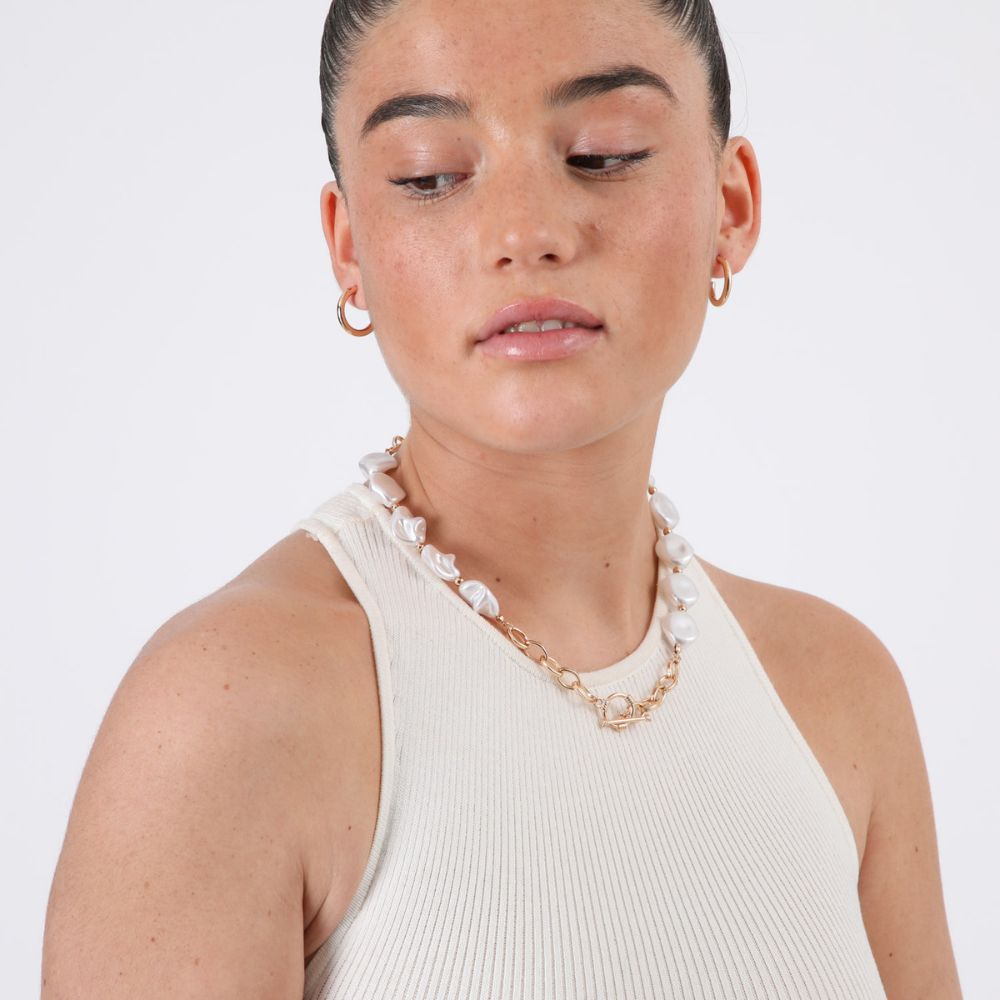 Collar corto en metal dorado. Consta de cadena compuesta de perlas de fantasía grandes irregulares, mostacillas doradas y una cadena ancha con cierre de "T" por el frente.