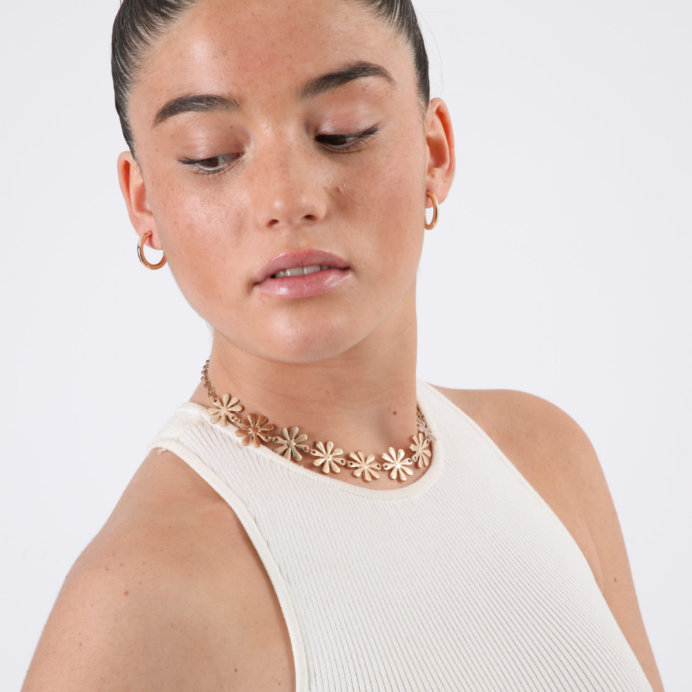 Collar tipo chocker en metal dorado. Consta de cadena compuesta por dijes de flores simples lisas.