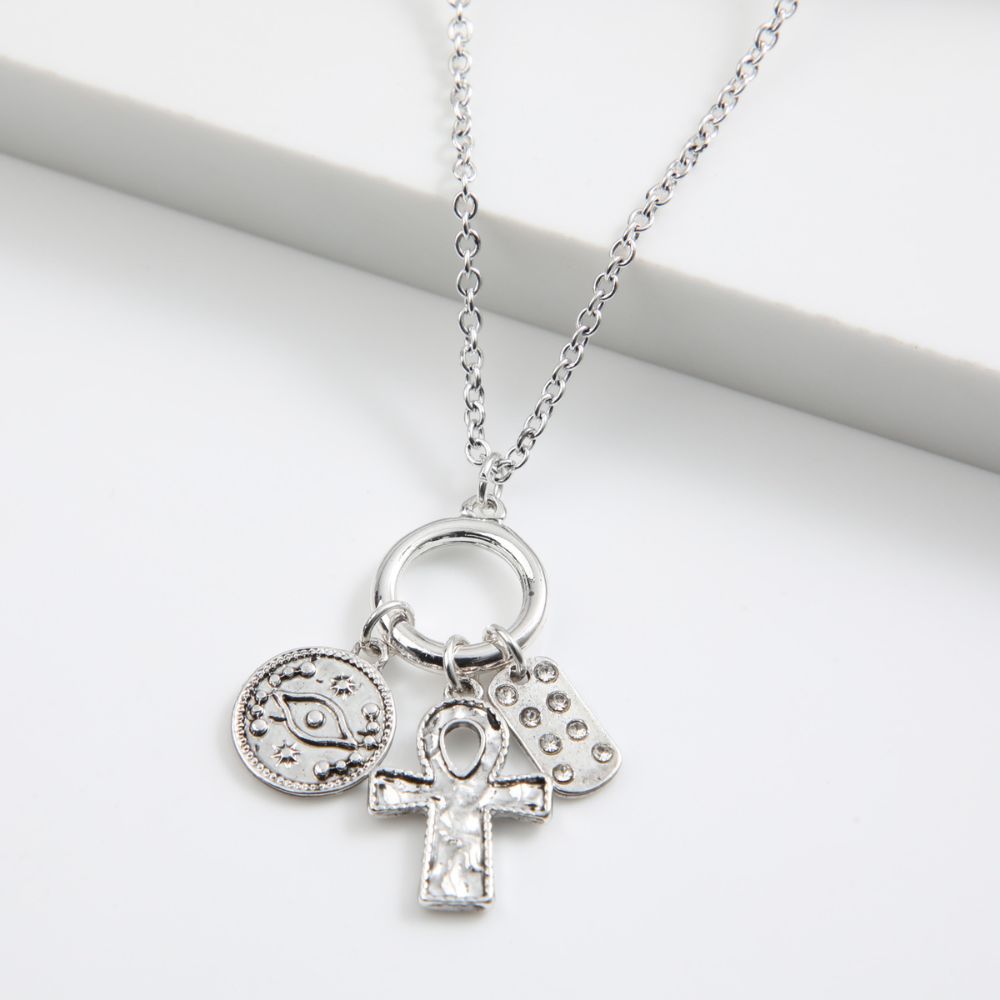 Collar corto en metal plateado. Consta de cadena delgada con dije de circunferencia con otros tres dijes de figuras pequeñas, un ojo, una cruz egipcia y una placa militar pequeña con ocho brillantes de fantasía blancos pequeños.