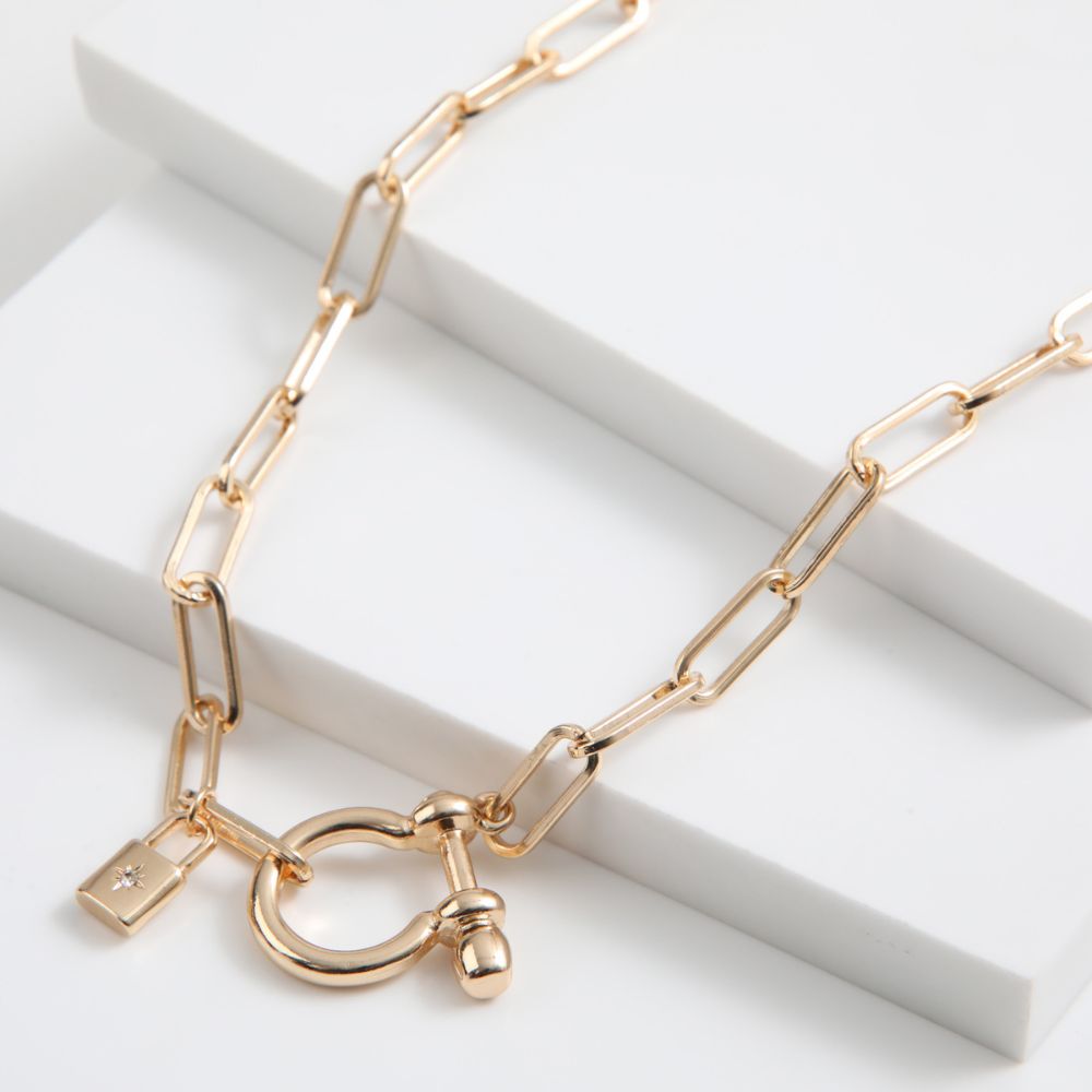 Collar corto en metal dorado, consta de una cadena ancha con dije tipo cierre de herradura grande y candado pequeño por el frente.