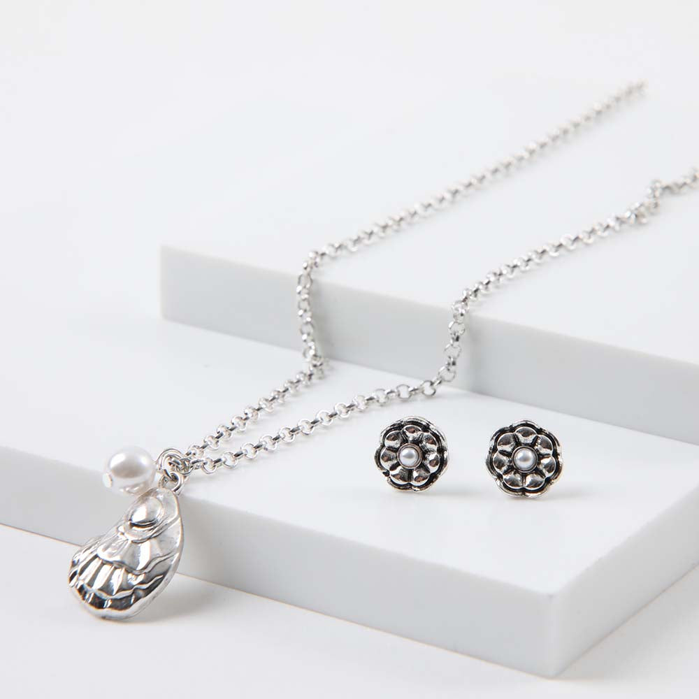 Este set está compuesto por un par de aros pegados con forma de flor y un collar de cadena delgada con un dije en forma de concha y una perla de fantasía redonda colgando.