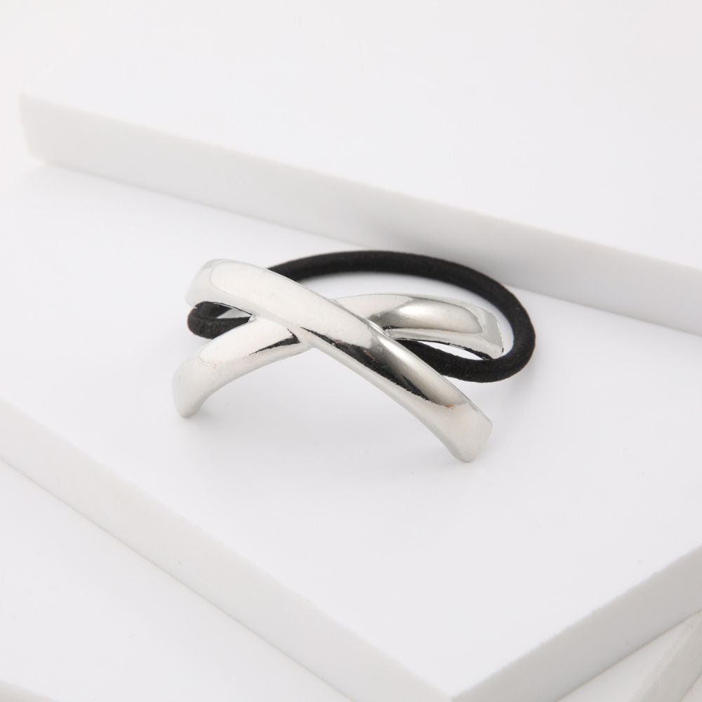 Collet o banda elástica negra simple con pieza metálica plateada grande en forma de dos líneas anchas, lisas, cruzadas y en curva.