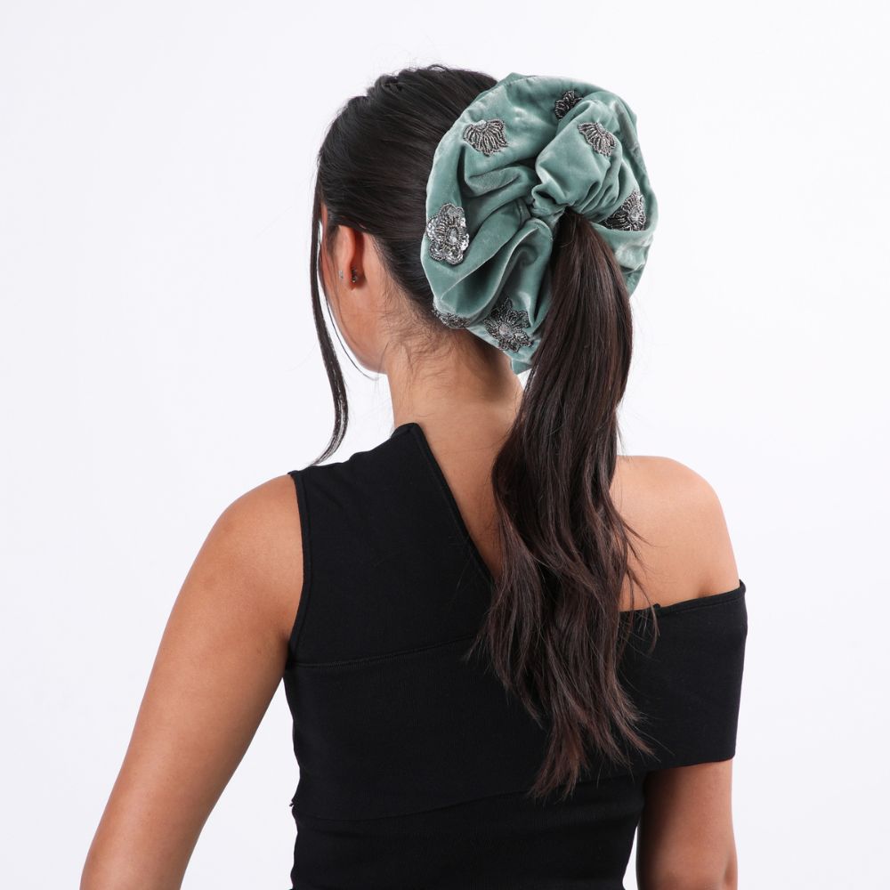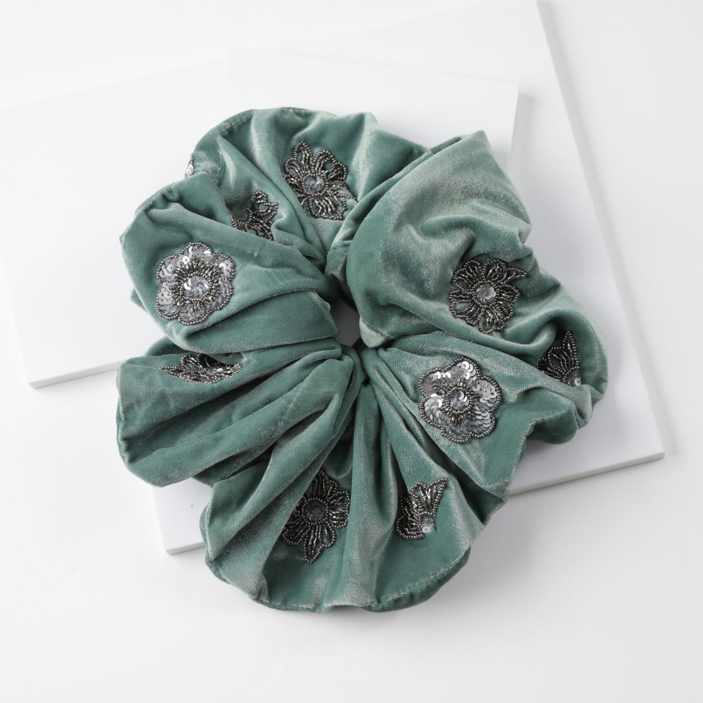 Collet/Scrunchie color verde menta de material tipo terciopelo con diseños de flores de mostacillas y lentejuelas plateadas.