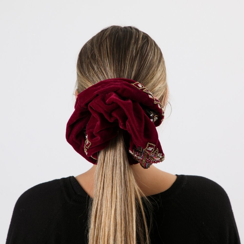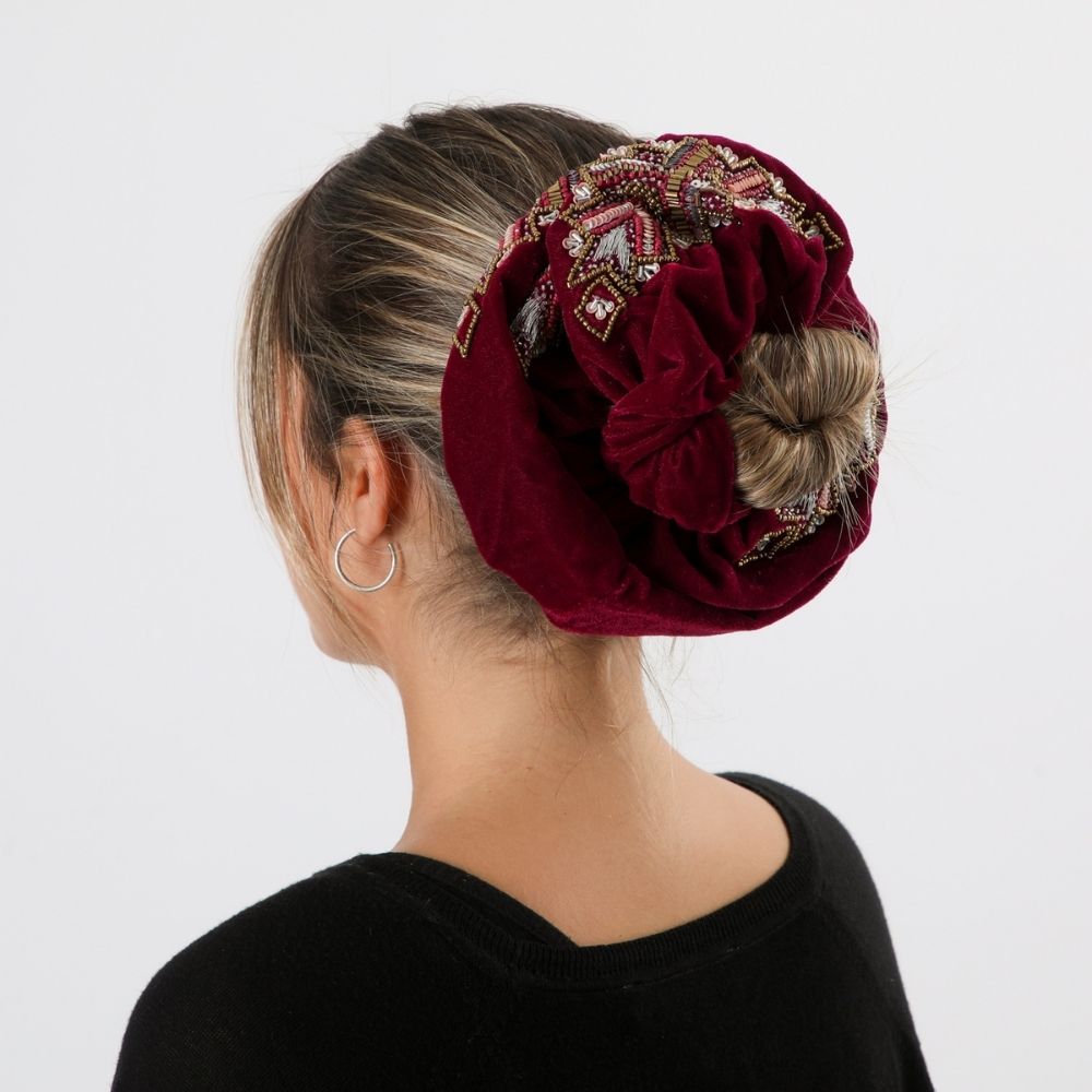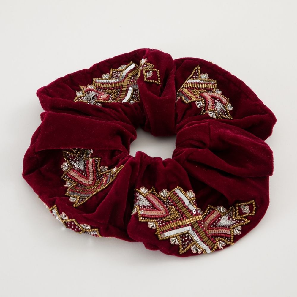 Collet o scrunchie de tela aterciopelada morada con detalles abstractos de mostacillas bordadas en tonos rosados, plateados y dorado oscuro.