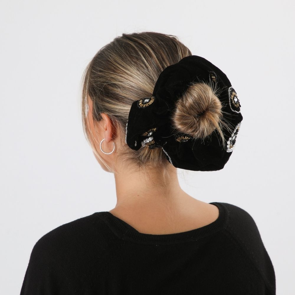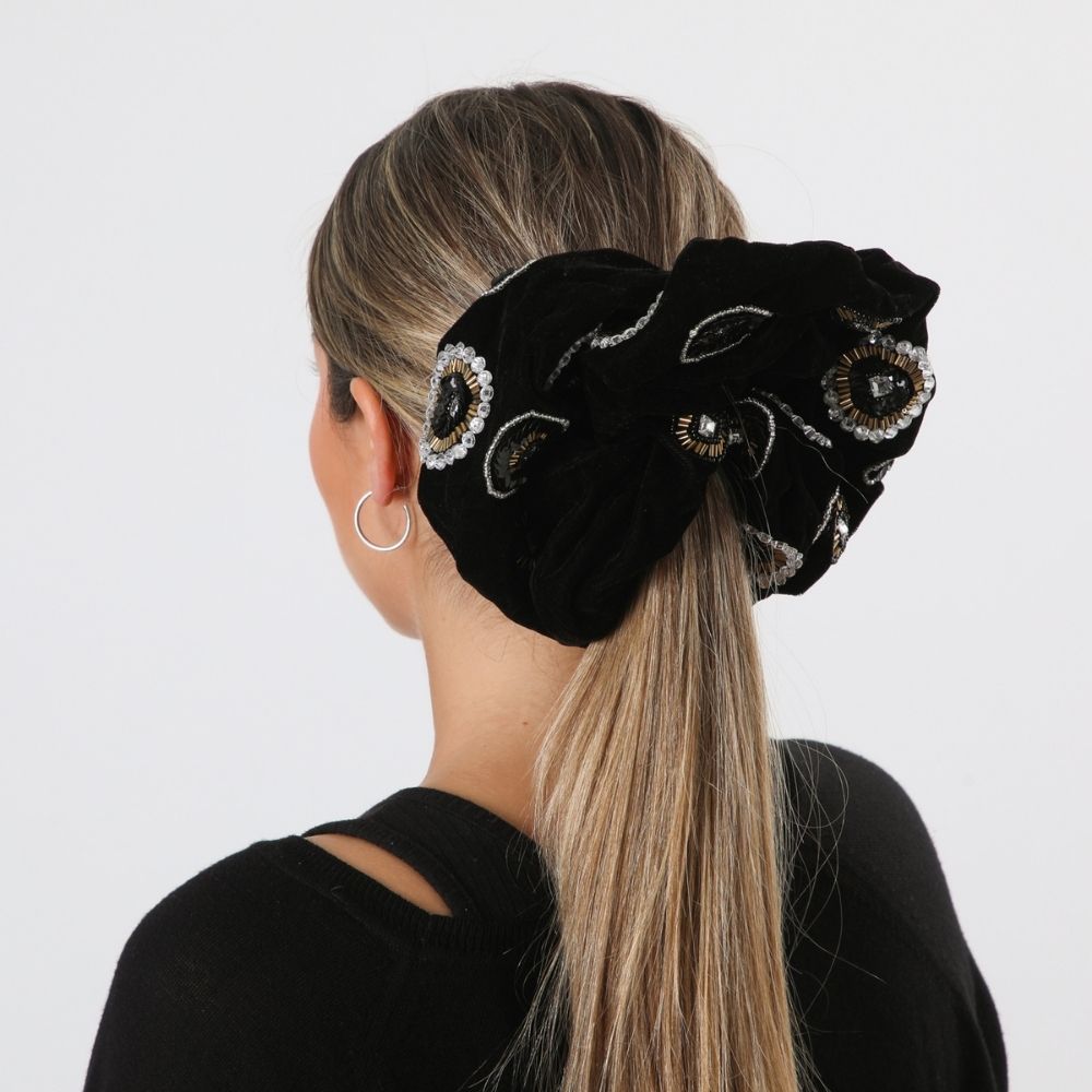 Collet o scrunchie de tela aterciopelada negra con círculos en distintos tamaños de mostacillas bordadas en tonos negros, plateados y dorado oscuro.