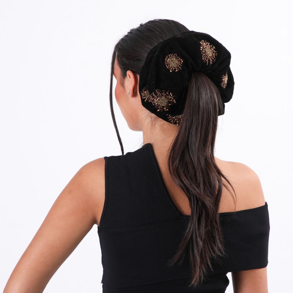 Collet/Scrunchie color negro de material tipo terciopelo con diseños de soles de mostacillas doradas y bronce.