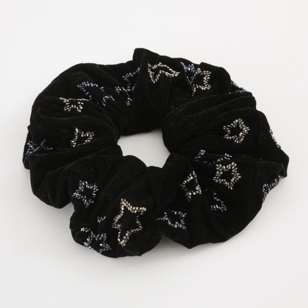Collet o scrunchie de tela aterciopelada negra con estrellas en distintos tamaños de mostacillas bordadas en tonos plateados y negros.