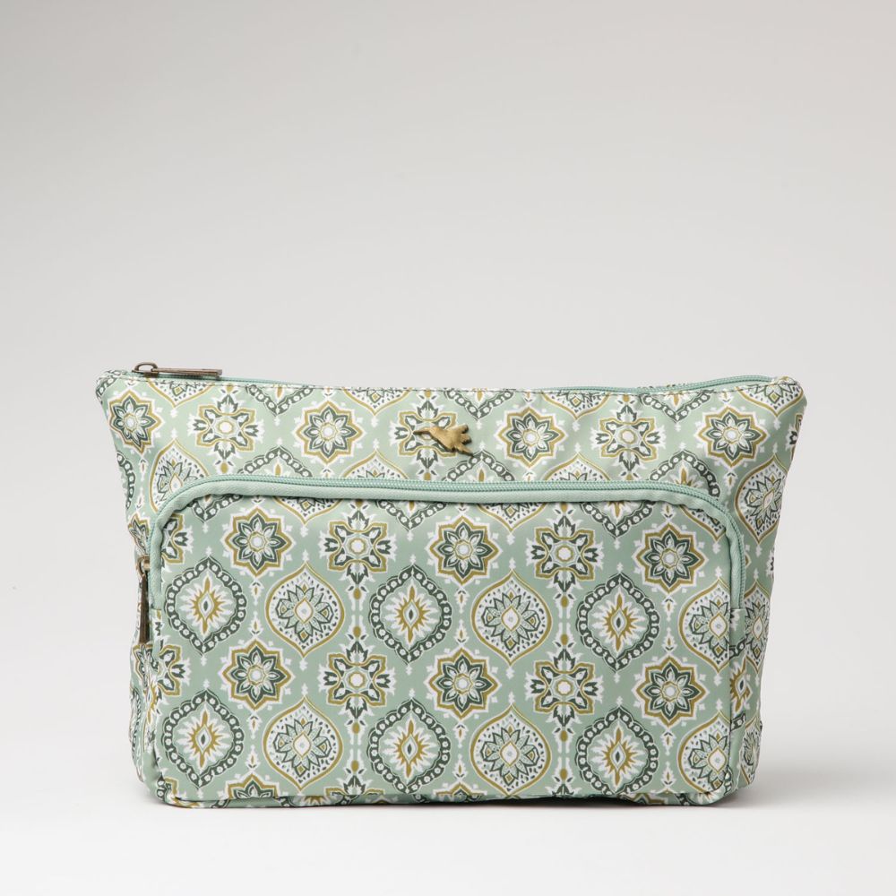 Cosmetiquero grande de doble compartimiento con cierre color verde con estampado rococo. Tiene interior impermeable, y en el compartimiento más grande tiene un espacio con cierre y dos lugares abiertos.