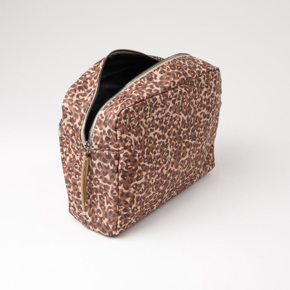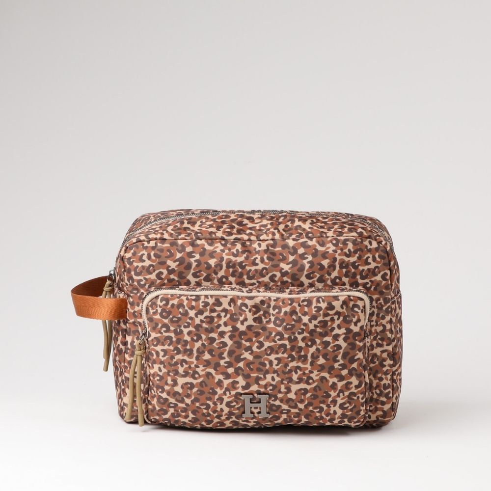 Cosmetiquero grande de nylon estampado en animal print con un compartimiento con cierre en el exterior, y 2 compartimientos abiertos en el interior y otro con cierre. Tiene una manilla para llevarlo.