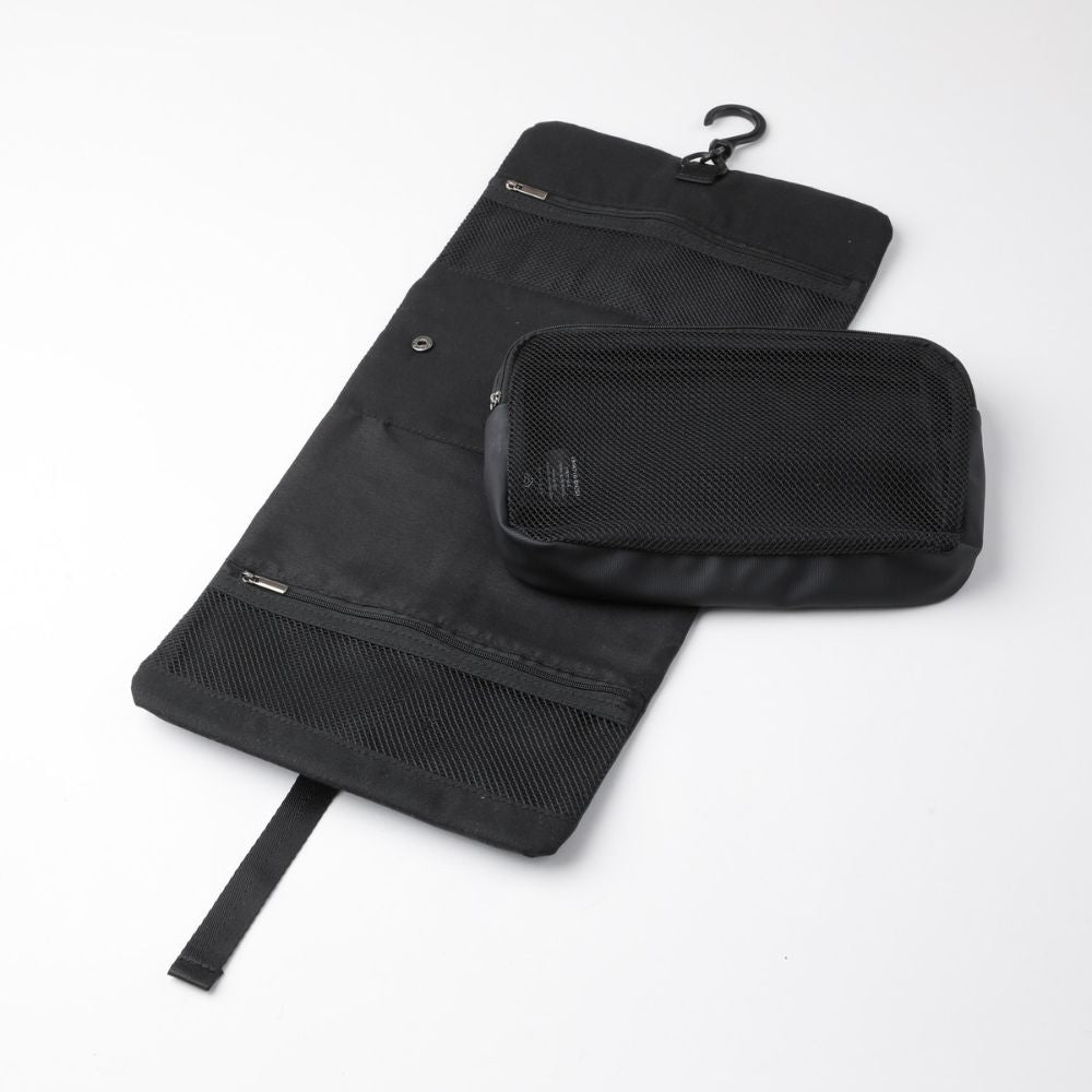 Cosmetiquero de viaje verde colgable con 3 compartimientos de malla.
