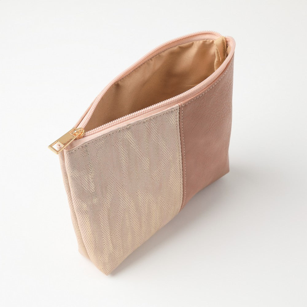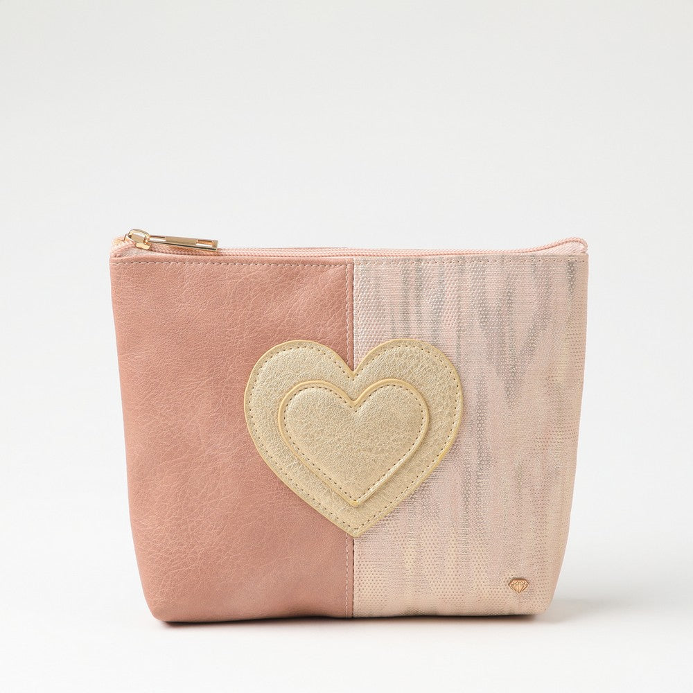Cosmetiquero de acabado suave en combinación rosado y metálico, con aplique de corazón en relieve al frente. Incluye cierre superior y costuras prolijas que le dan una buena terminación.Ideal para llevar maquillaje, accesorios o esenciales del día a día. Un complemento práctico y fácil de combinar.