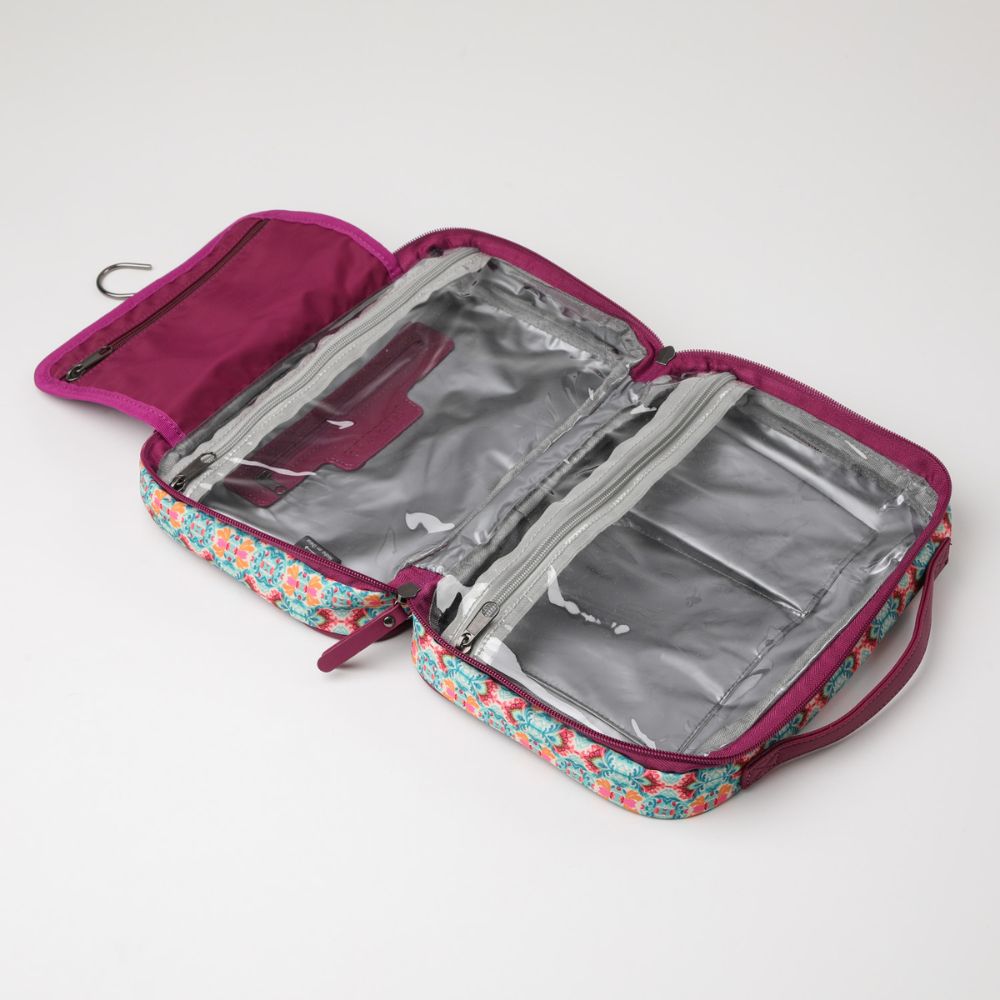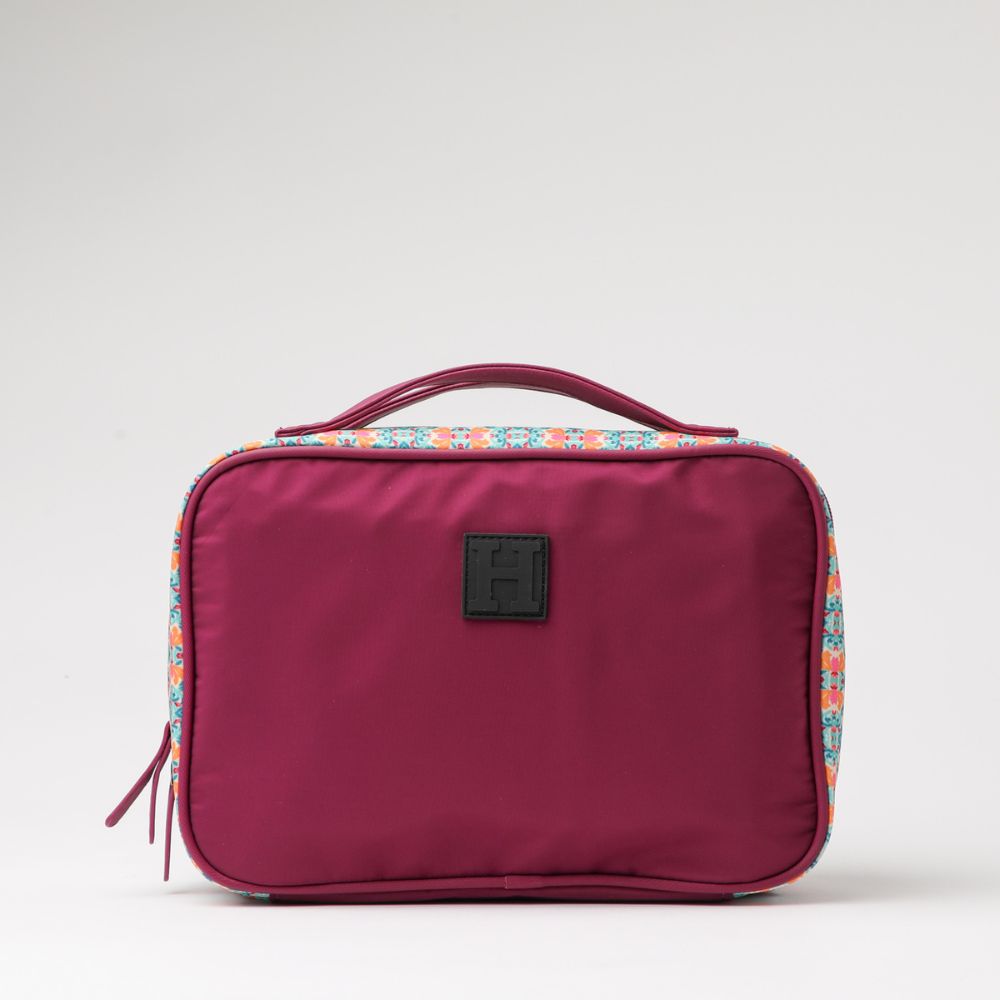 Cosmetiquero de nylon morado con cierre y dos asas. Por el reves lleva un bolsillo con cierre y por dentro tiene tres bolsillos con cierre, donde dos son transparentes y en su interior, uno tiene otro bolsillo con cierre y el otro tiene dos bolsillos abiertos, y el tercero cuenta con un gancho para colgarse. Los costados llevan un estampado tipo mosaico en colores turquesas, rosado y naranja sobre beige y los cierres y gancho son de metal plateado oscuro.