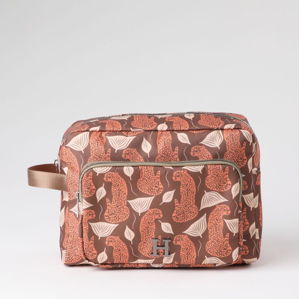 Cosmetiquero grande de nylon estampado con cheeta y hojas en tonalidades naranjas y cafés, con compartimiento con cierre exterior, e interior con bolsillos abiertos y con cierre.