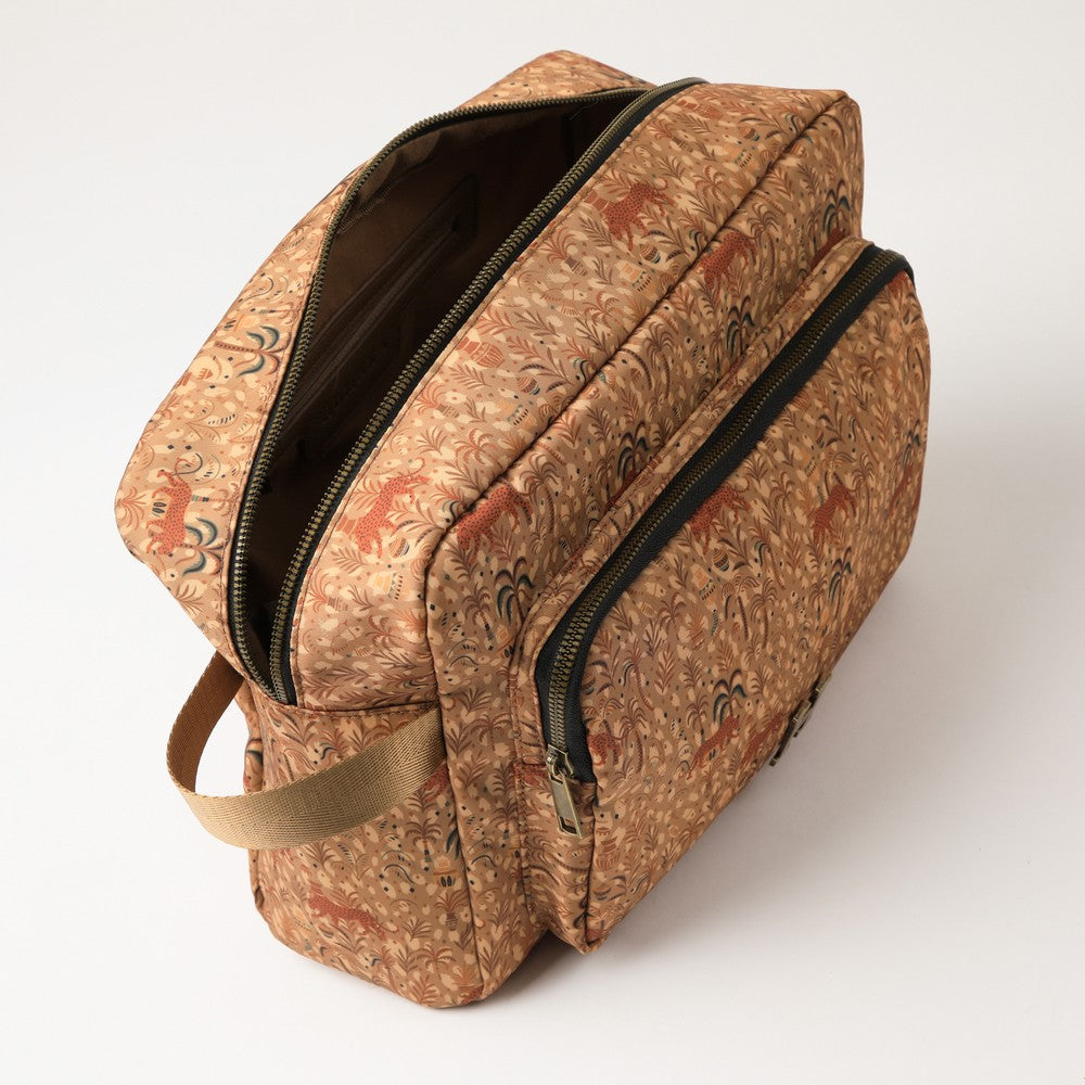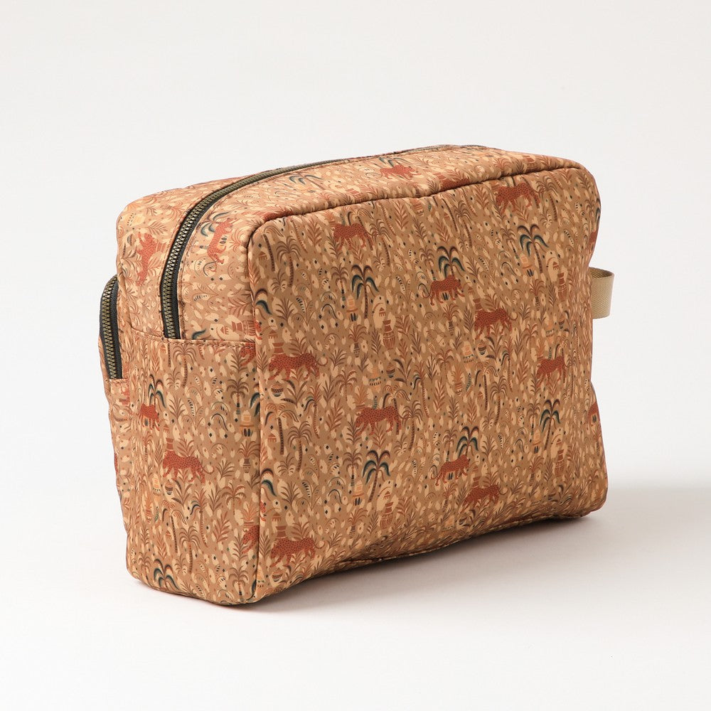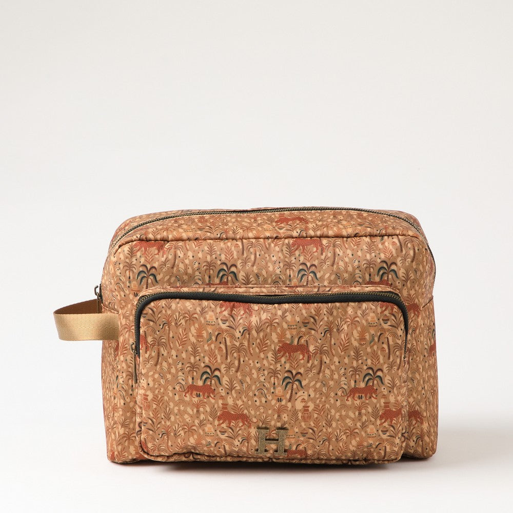 Cosmetiquero en tela estampada, con diseño ilustrado en tonos tierra. Incluye doble compartimento con cierre, bolsillo interior con cierre y asa lateral. De uso práctico para organizar maquillaje, artículos de cuidado personal o accesorios de viaje. Un diseño moderno y funcional.