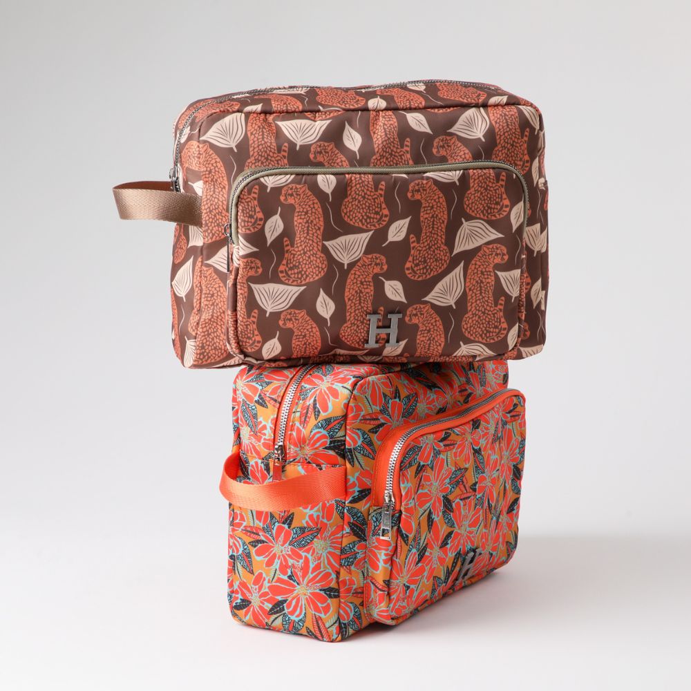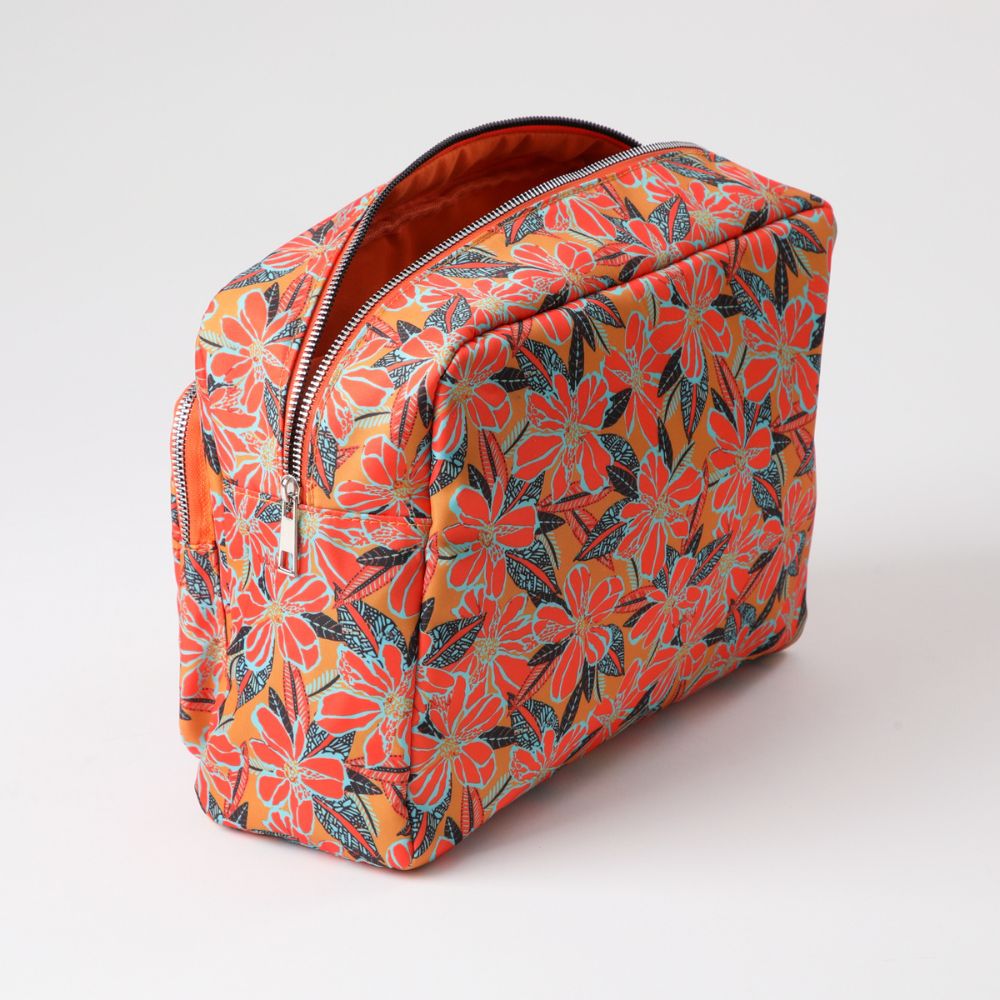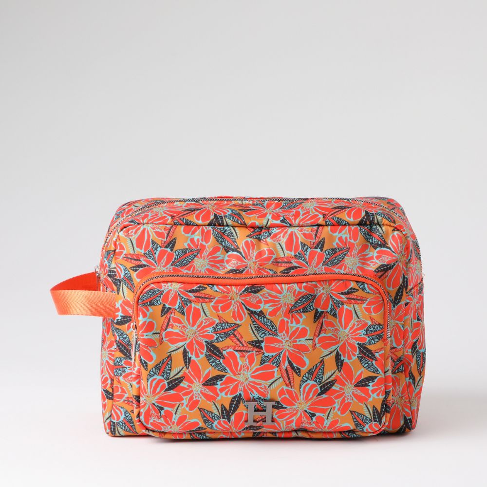 Cosmetiquero grande de nylon estampado con flores en tonalidades naranjas y celestes, con compartimiento con cierre exterior, e interior con bolsillos abiertos y con cierre.