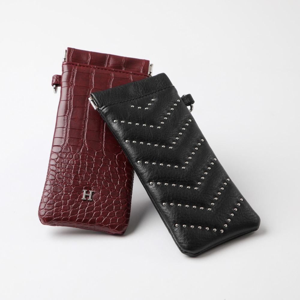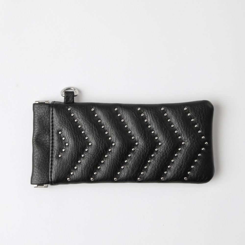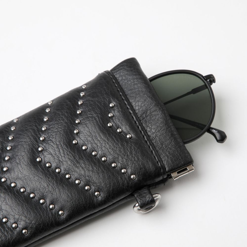 Estuche para anteojos/lentes de ecocuero negro y boca con iman. El frente lleva un patrón de tachas en fila y forma de "V". Por el costado hay una argolla para colgar o enganchar. Las tachas, argolla, logo e iman son de metal plateado.