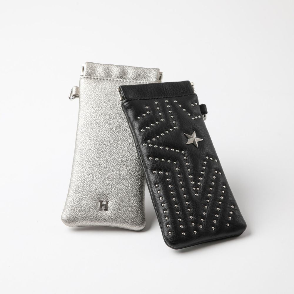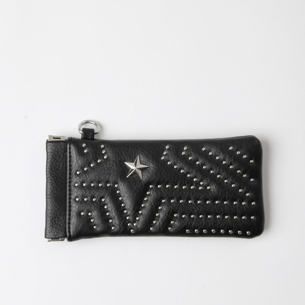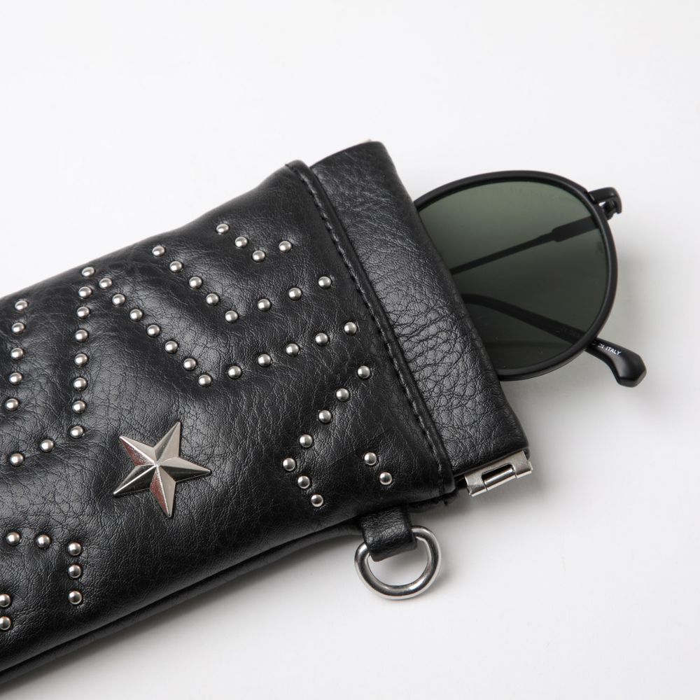Estuche para anteojos/lentes de ecocuero negro y boca con iman. El frente lleva un patrón de tachas plateadas con forma de estrellas. Por el costado hay una argolla para colgar o enganchar. Las tachas, argolla, logo e iman son de metal plateado.