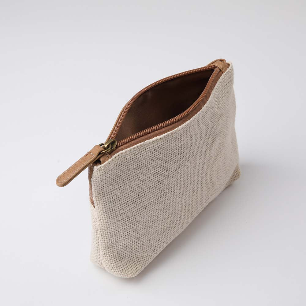 Estuche Humana Shadow de color beige perteneciente a la colección Coastal breeze. Este estuche tiene una combinación material de ecocuero café con tela beige. Cuenta con su bolsillo principal con cierre y otro en la parte frontal.