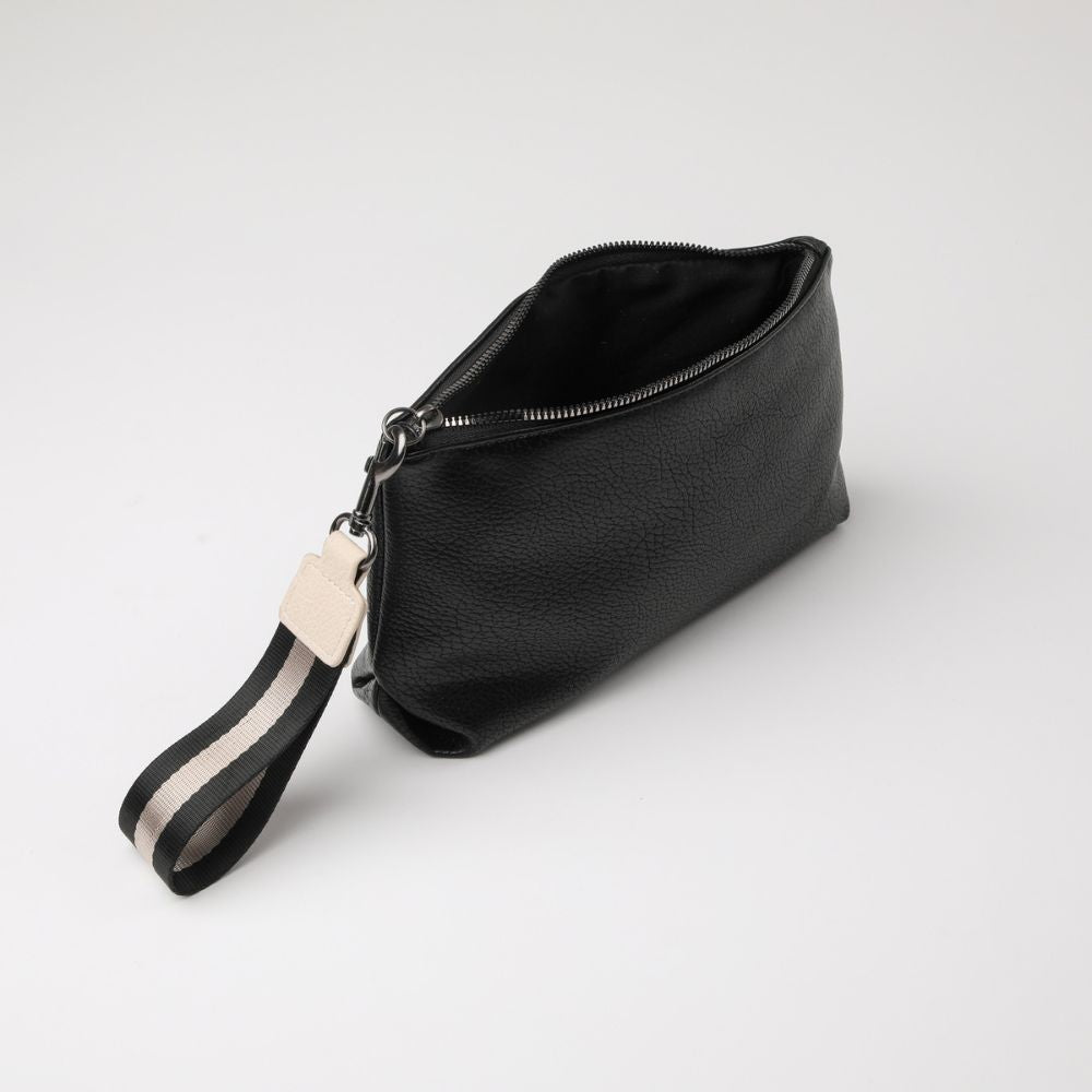 Estuche grande de ecocuero negro con cierre, bolsillo con cierre en su interior y correa removible negra con crema