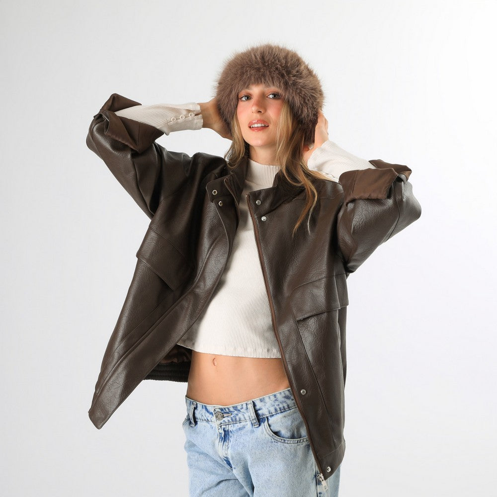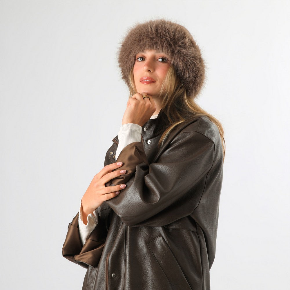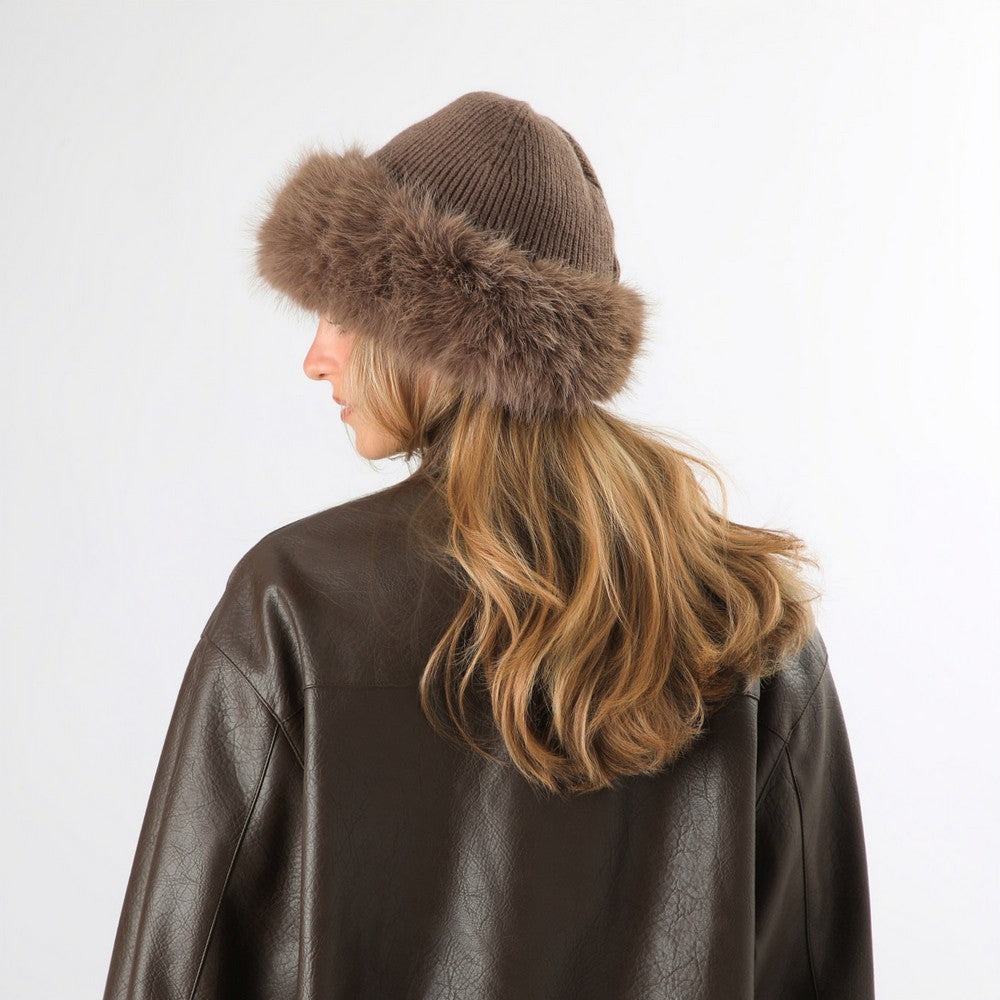 Gorro de punto en color taupe, con aplicación de pelo sintético en el borde. Presenta un diseño simple y abrigador, ideal para complementar looks de invierno.