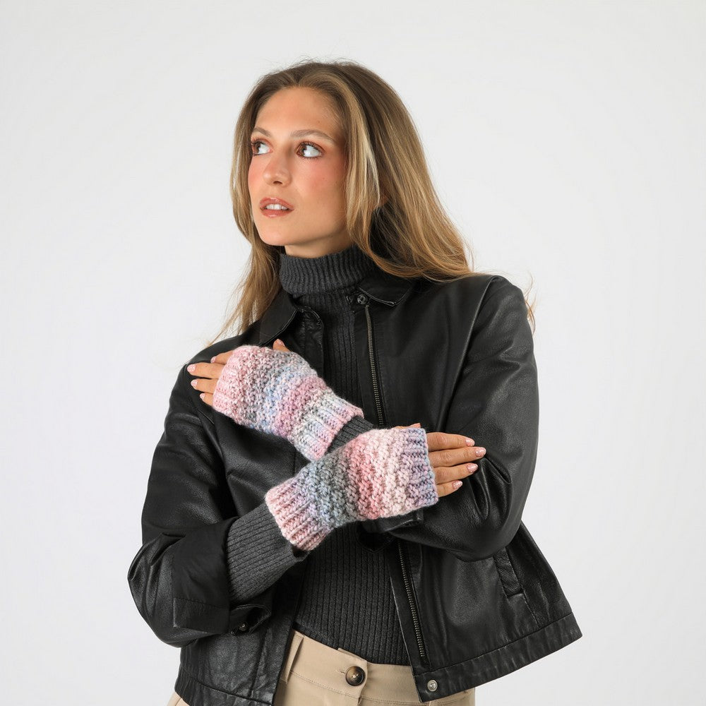 Mitones tejidos de punto grueso, con mezcla de tonos rosados, lila y verdes suaves que crean un efecto degradado. Cómodo y abrigador, ideal para mantener las manos cálidas sin perder movilidad. Un accesorio práctico y fácil de combinar para los días fríos.