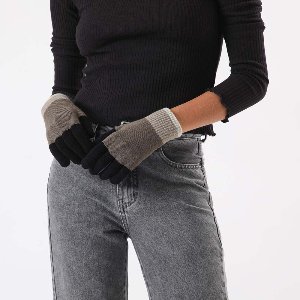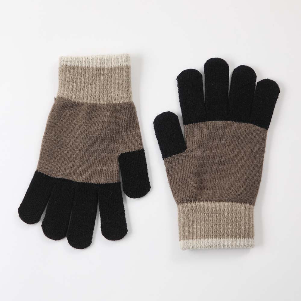 Guantes tejidos de color café con puños ribeteados en café. El dedo índice y pulgar cuentan con una punta especial para utilizar pantallas touch.