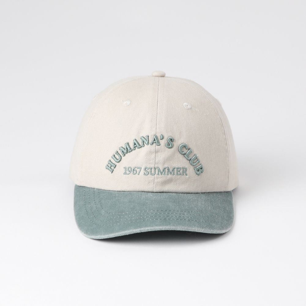 Jockey color beige claro con visera verde agua desgastado con "HUMANA'S CLUB" y "1967 SUMMER" bordados en el mismo color que la visera por el frente. Lleva una hebilla ajustable por el revés.