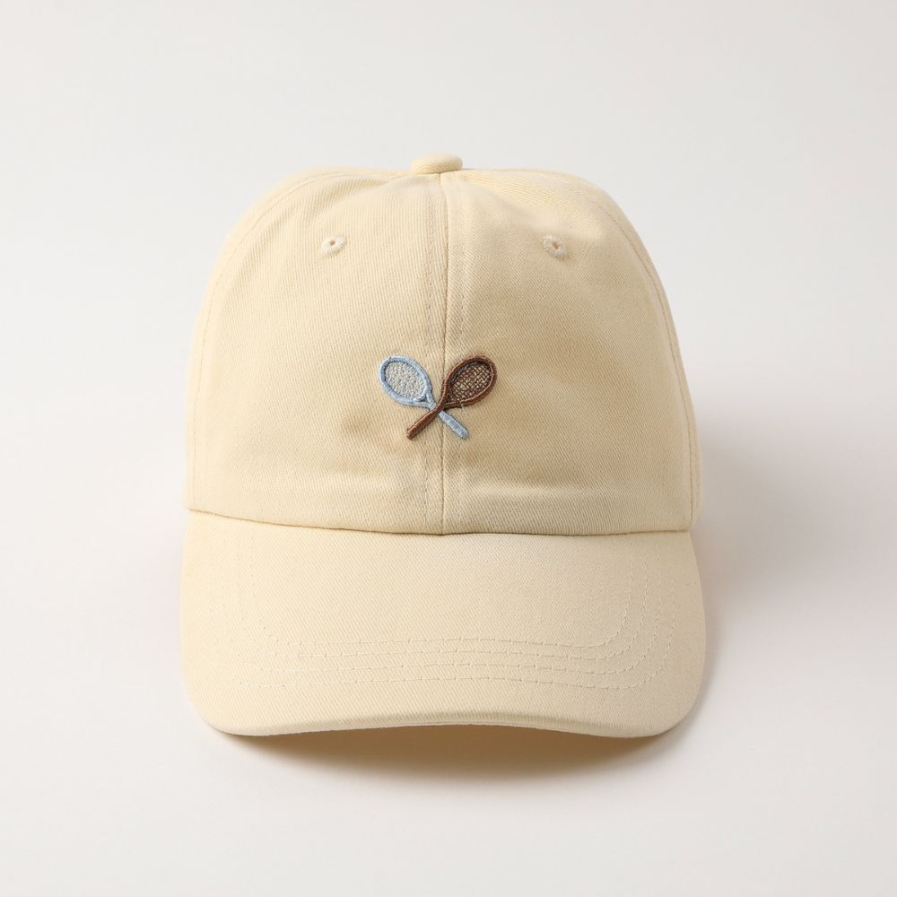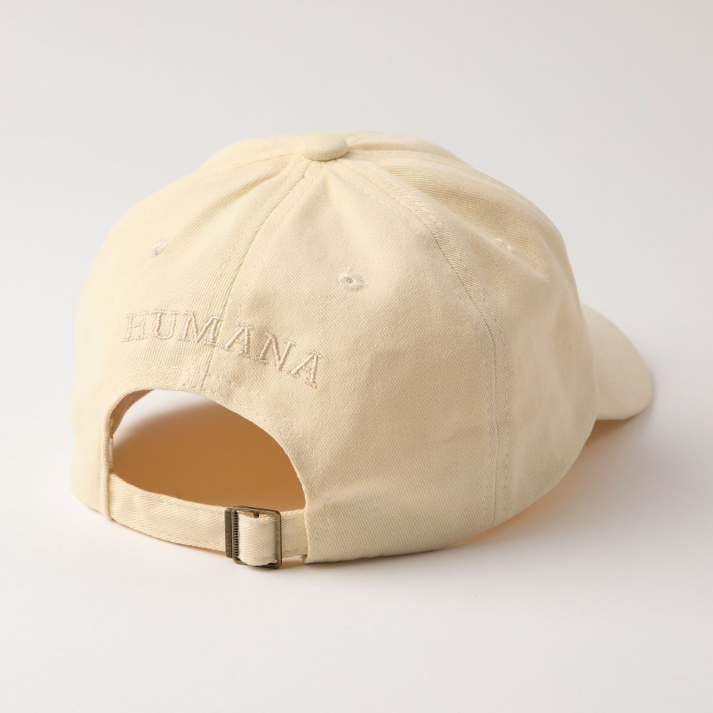 Jockey color café con un "I'm Happy" bordado en frente superior y línea por el borde de la visera, en color amarillo. Lleva una hebilla ajustable por el revés.