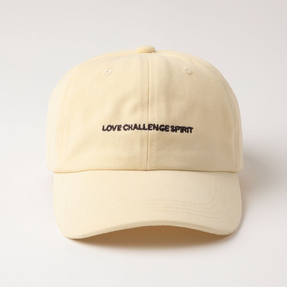 Jockey color amarillo claro desgastado con frase "LOVE CHALLENGE SPIRIT" bordado por el frente en hilo café chocolate. Lleva una hebilla ajustable por el revés.