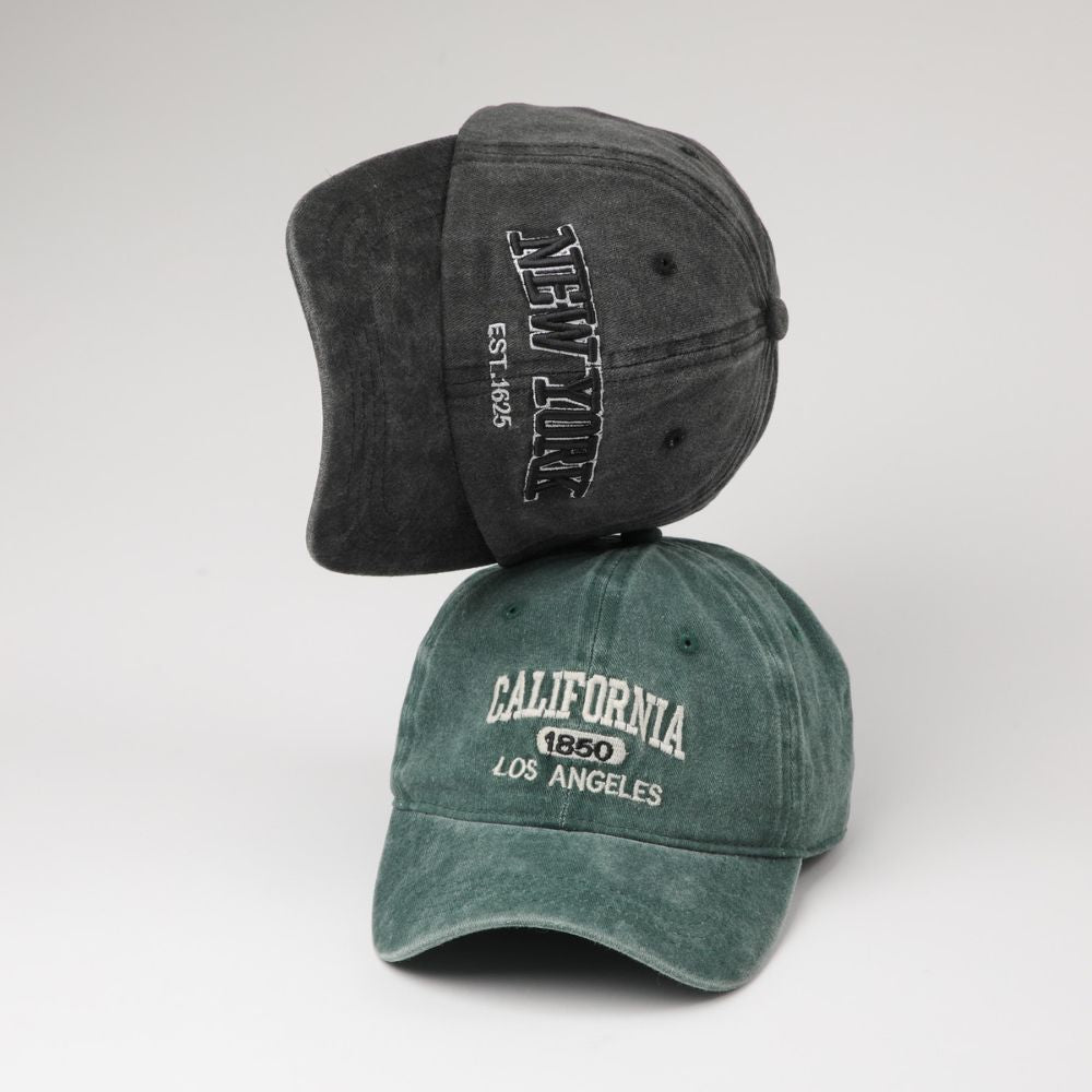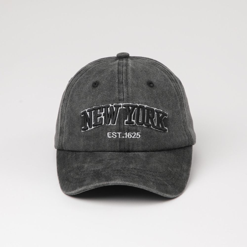 Gorro tipo jockey ajustable color burdeo desgastado con la palabra "New York" bordado en frente y la marca humana bordada detrás en color burdeo.