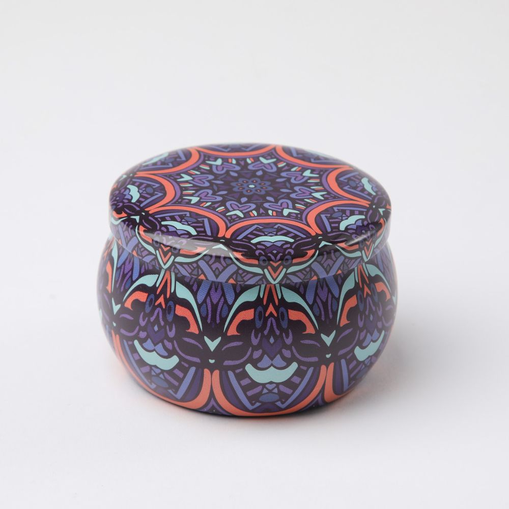 Joyero metálico redondo mandala morado, azul, celeste y naranjo
