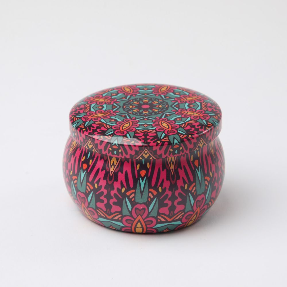 Joyero metálico redondo mandala fucsia, turquesa y naranjo.
