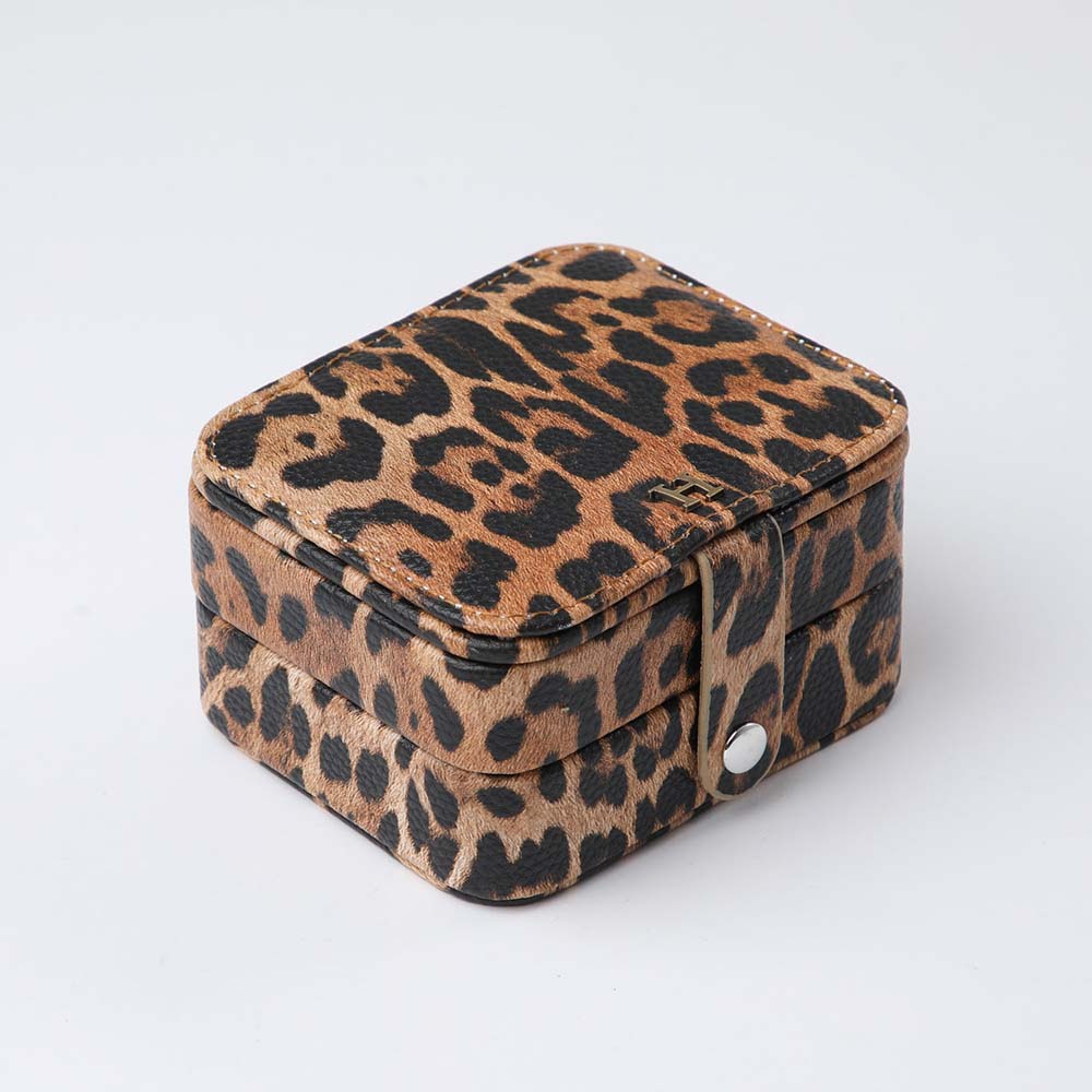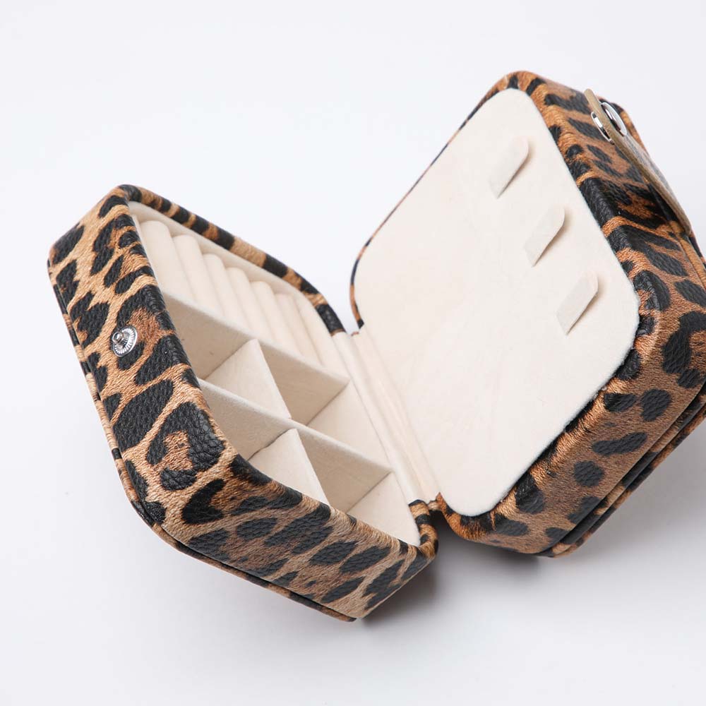 Joyero de ecocuero con estampado de leopardo. El interior del joyero tiene forro afelpado color crudo. El joyero cuenta con un compartimiento para guardar 5 pares de aros, almohadillas para 6 anillos, 3 ganchos para pulseras o collares y 4 compartimientos