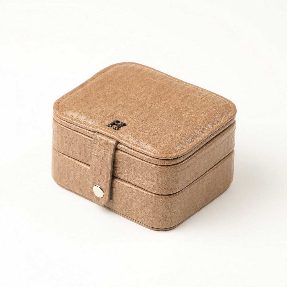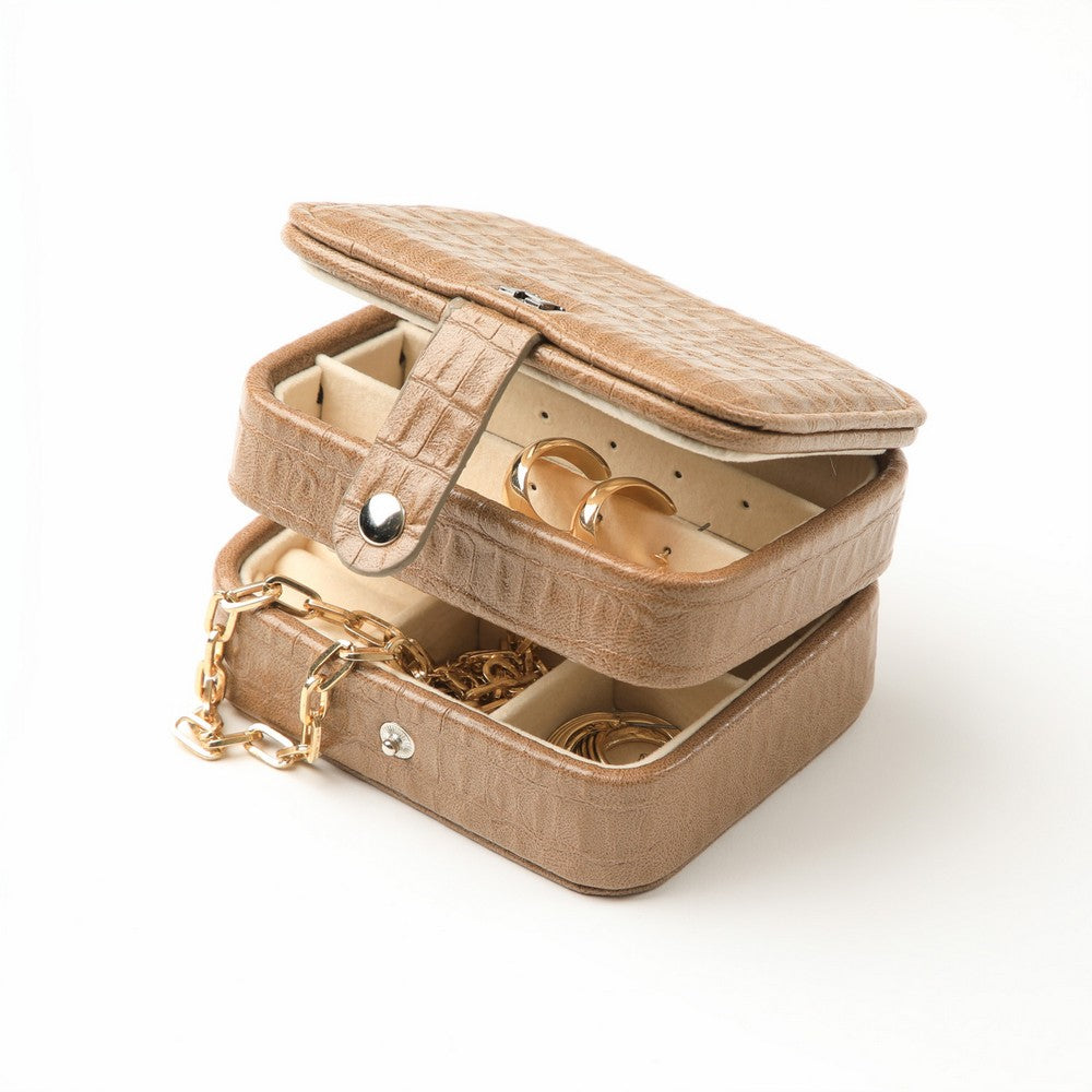 Joyero compacto, color café con textura croco. Diseño cuadrado con tapa y cierre a presión, detalle metálico con logo al frente. Interior con espejo incorporado y compartimentos para organizar aros y joyas pequeñas.