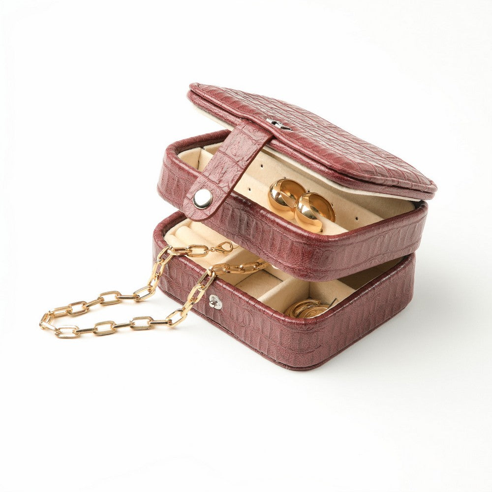 Joyero compacto, color burdeo con textura croco. Diseño cuadrado con tapa y cierre a presión, detalle metálico con logo al frente. Interior con espejo incorporado y compartimentos para organizar aros y joyas pequeñas.