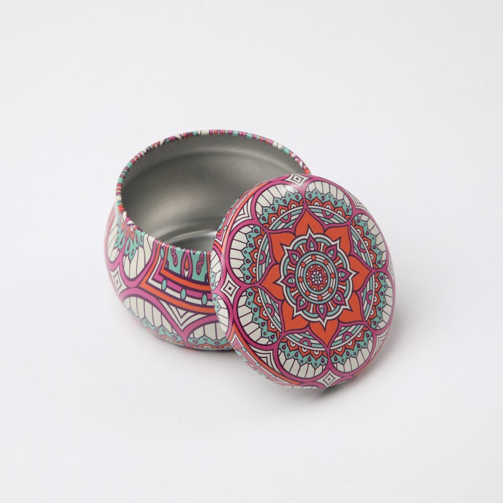 Joyero metálico redondo mandala rosado, blanco, celeste y naranjo