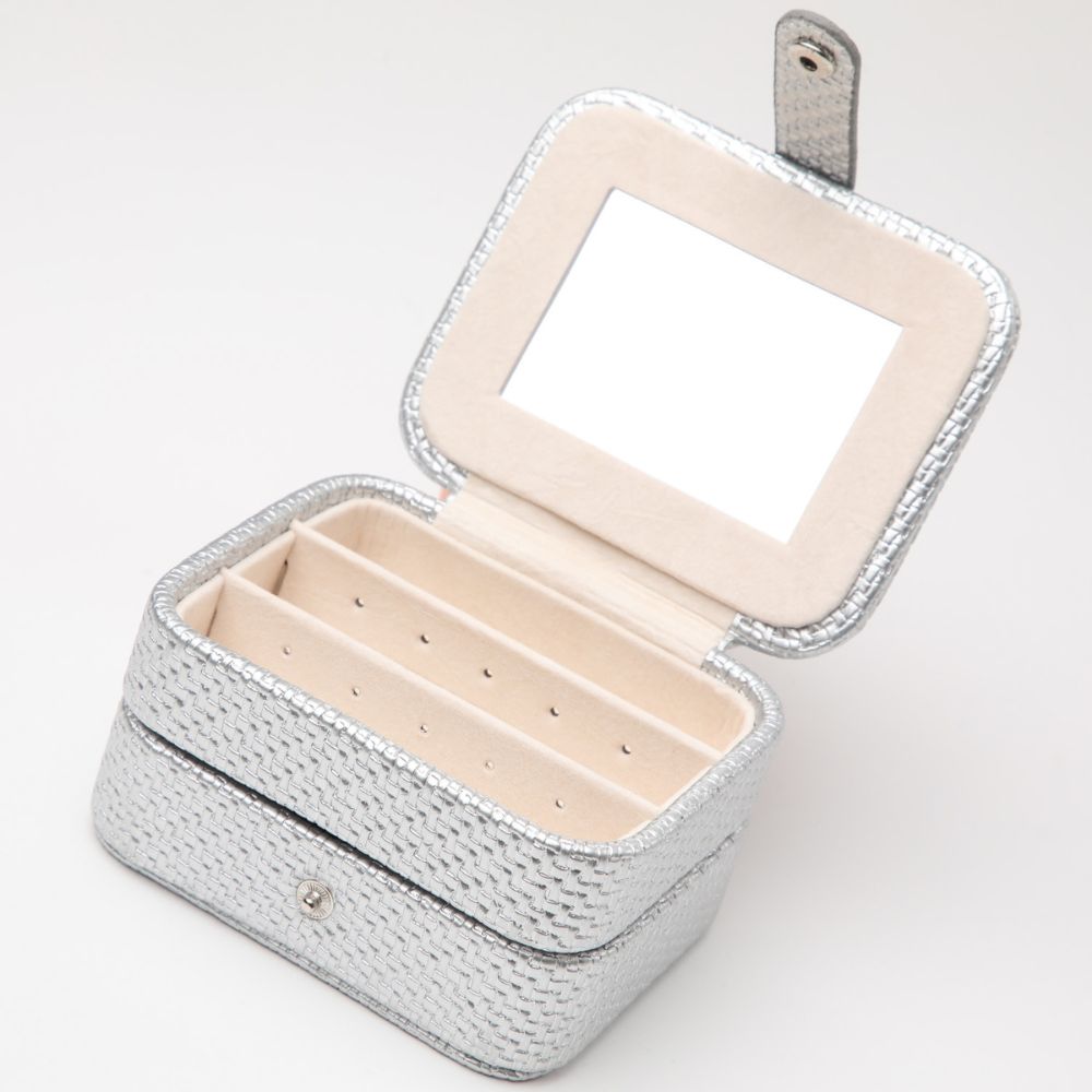 Joyero plateado ecocuero textura mimbre de 2 pisos. En el primer piso cuenta con un espejo y un espacio para colocar aros removible. En el segundo piso tiene un espacio para colocar 6 anillos y un lugar dividido en cuatro secciones.