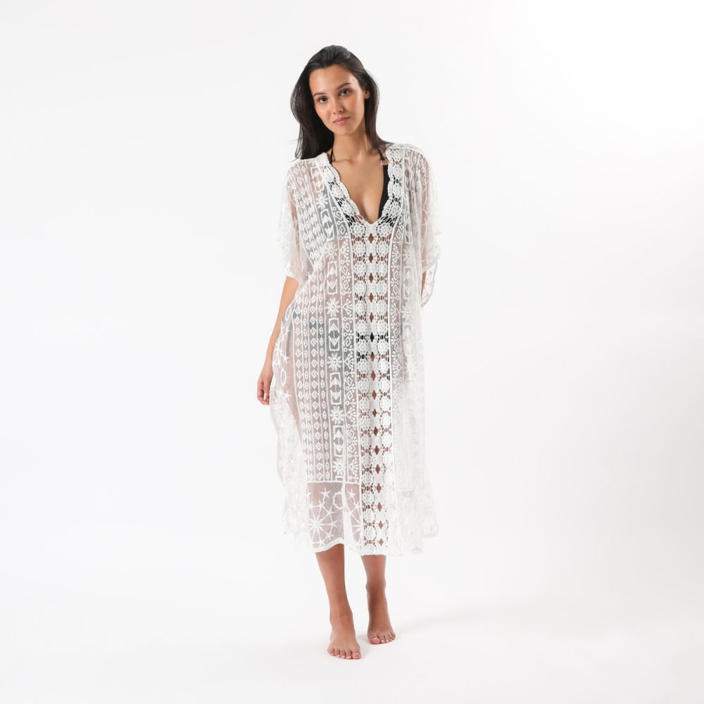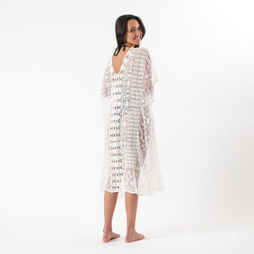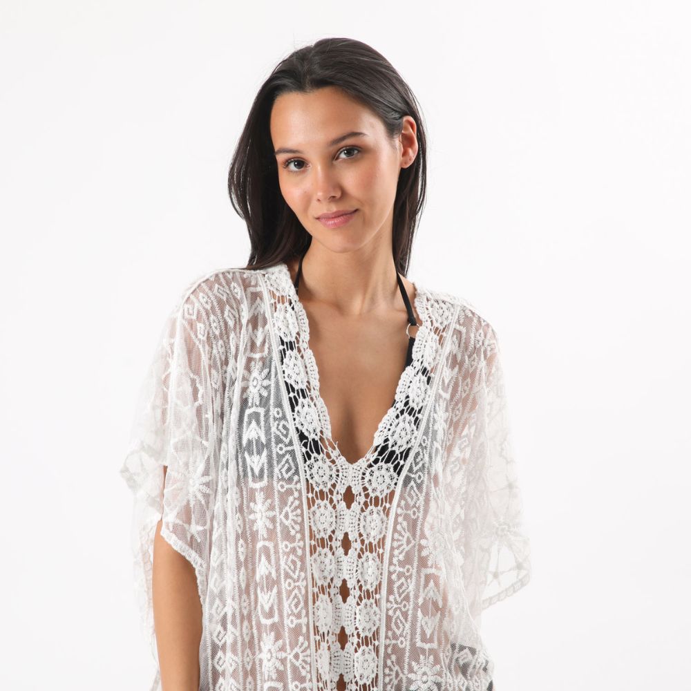 Kimono cerrado corto blanco semi transparente con bordados tipo encaje con motivos de iconos blancos