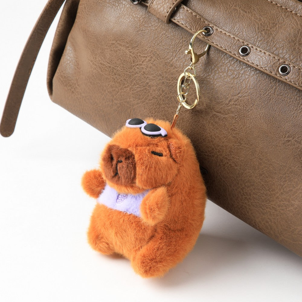 Llavero con diseño de capibara en tono café. Incluye detalles decorativos como lentes y chaleco, además de argolla metálica para colgar. Un accesorio decorativo, ideal para personalizar bolsos o llaves.